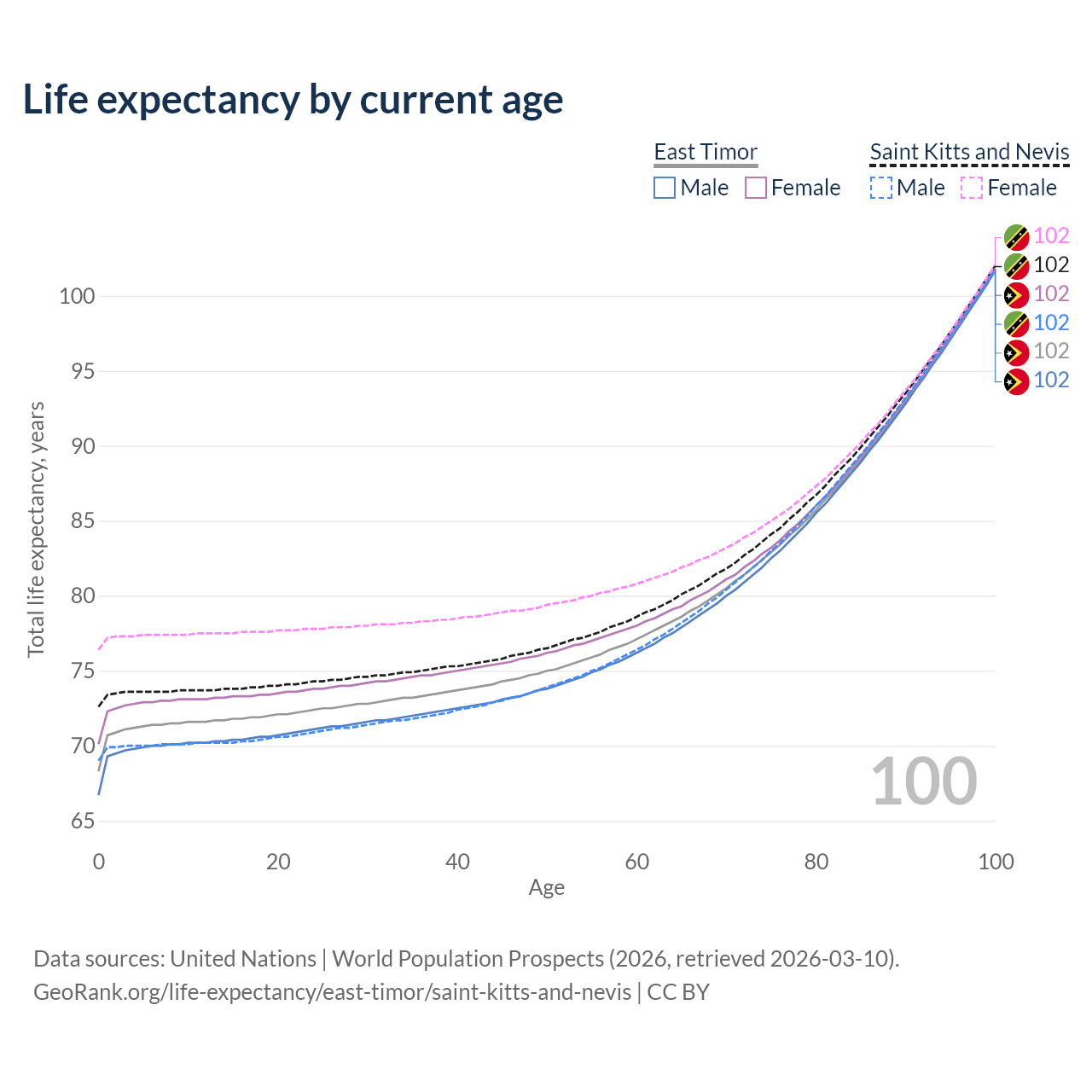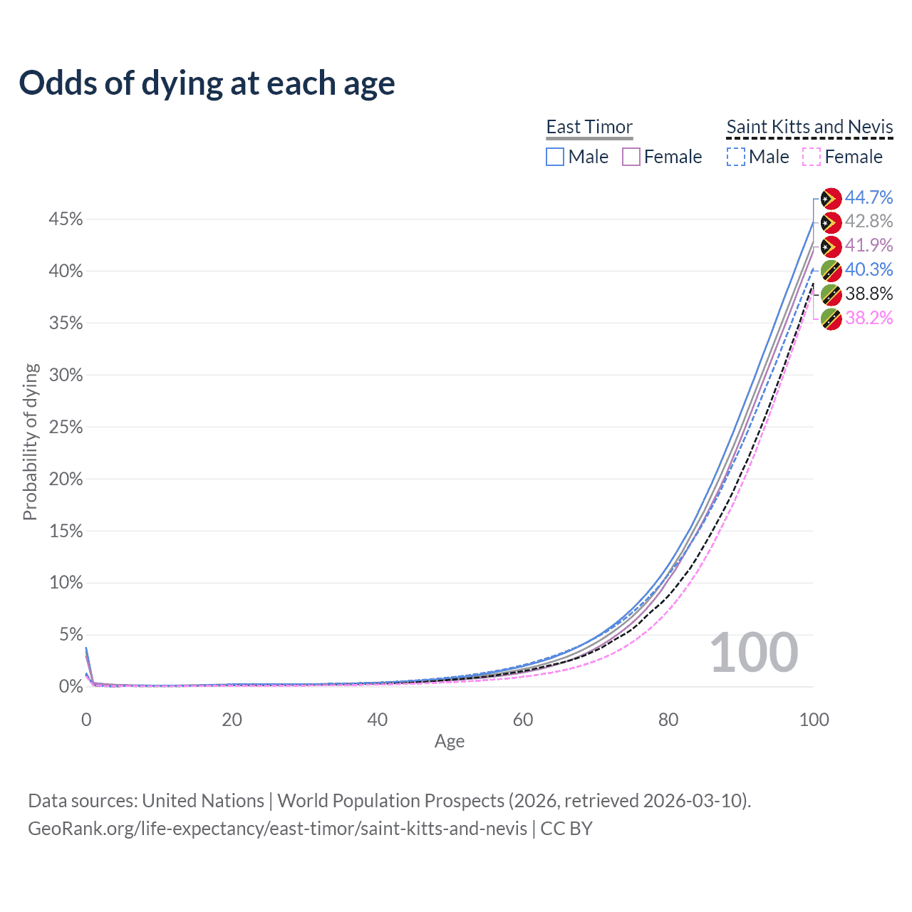 This life expectancy calculator shows the odds of living to 100, 95, 90, and below based on current age for both males and females in East Timor and Saint Kitts and Nevis, along with mean and median age of death. The calculations are based on the 2026 life tables (actuarial tables) from the UN World Population Prospects.
