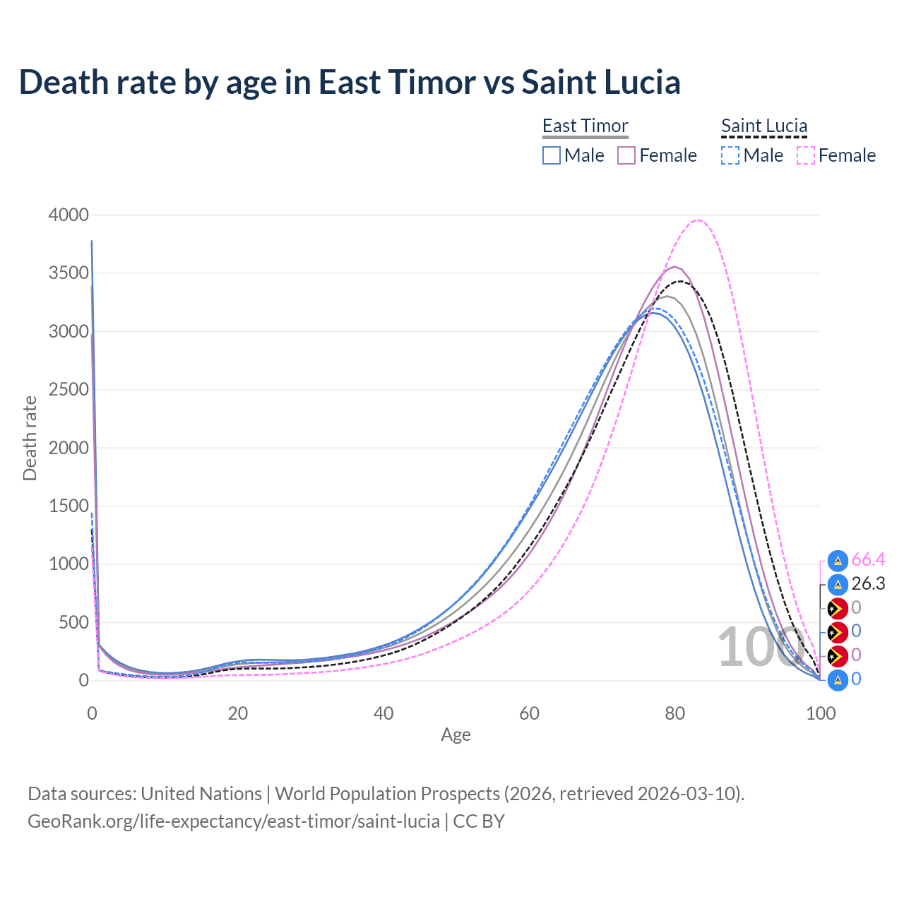 In East Timor, the most common age of death is 0, compared to 81 in Saint Lucia. The median age of death is 73.9 in East Timor and 76.8 in Saint Lucia, meaning only half of each cohort is expected to live past that age.