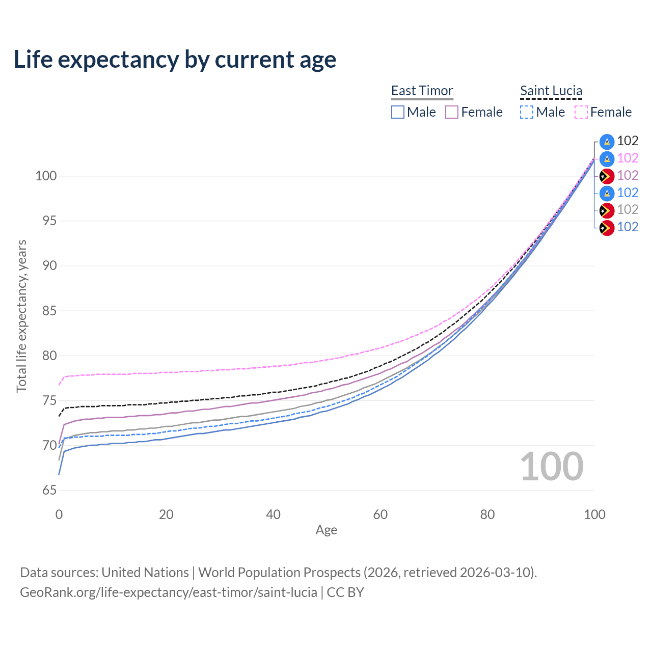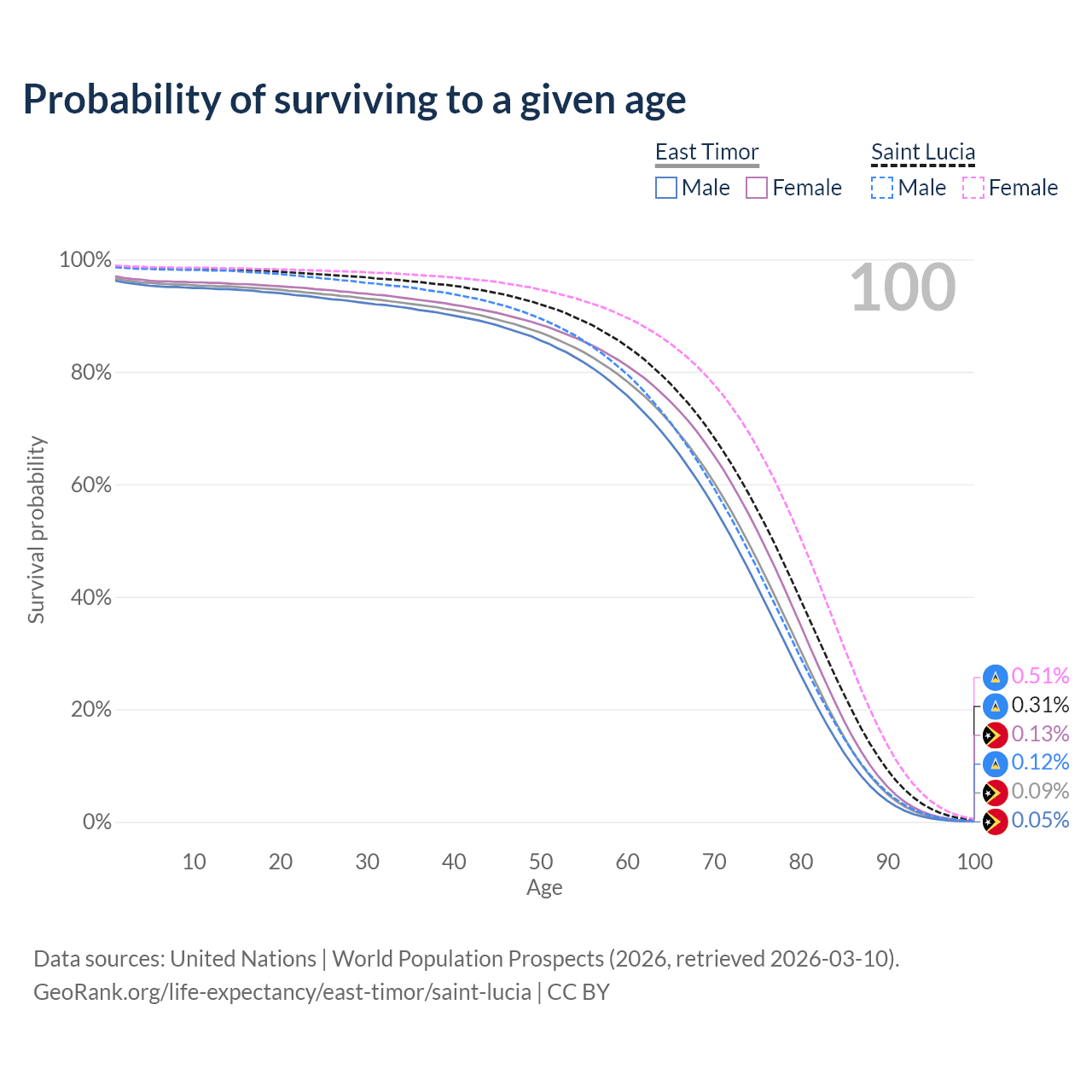 This life expectancy calculator shows the odds of living to 100, 95, 90, and below based on current age for both males and females in East Timor and Saint Lucia, along with mean and median age of death. The calculations are based on the 2026 life tables (actuarial tables) from the UN World Population Prospects.