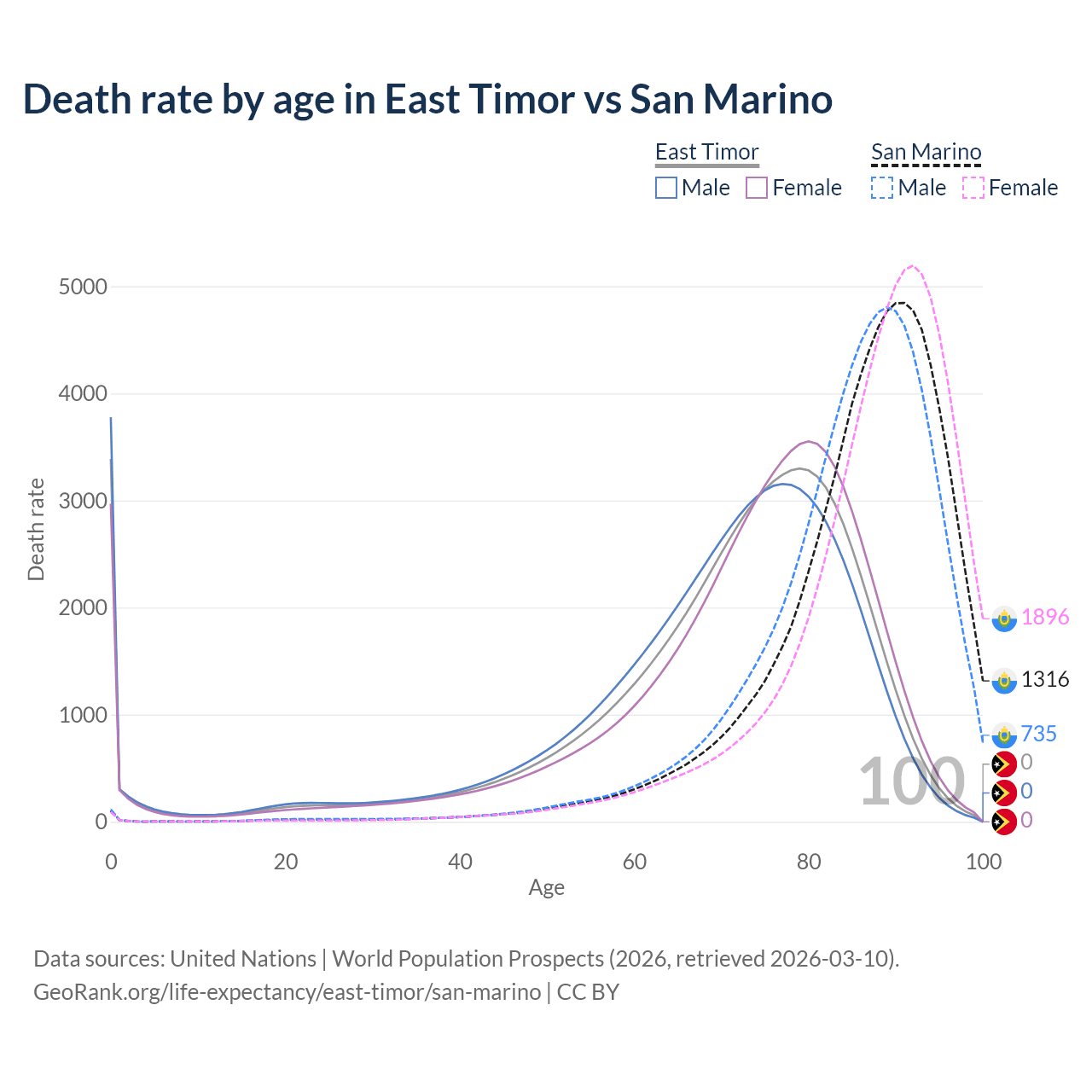 In East Timor, the most common age of death is 0, compared to 91 in San Marino. The median age of death is 73.9 in East Timor and 88.3 in San Marino, meaning only half of each cohort is expected to live past that age.