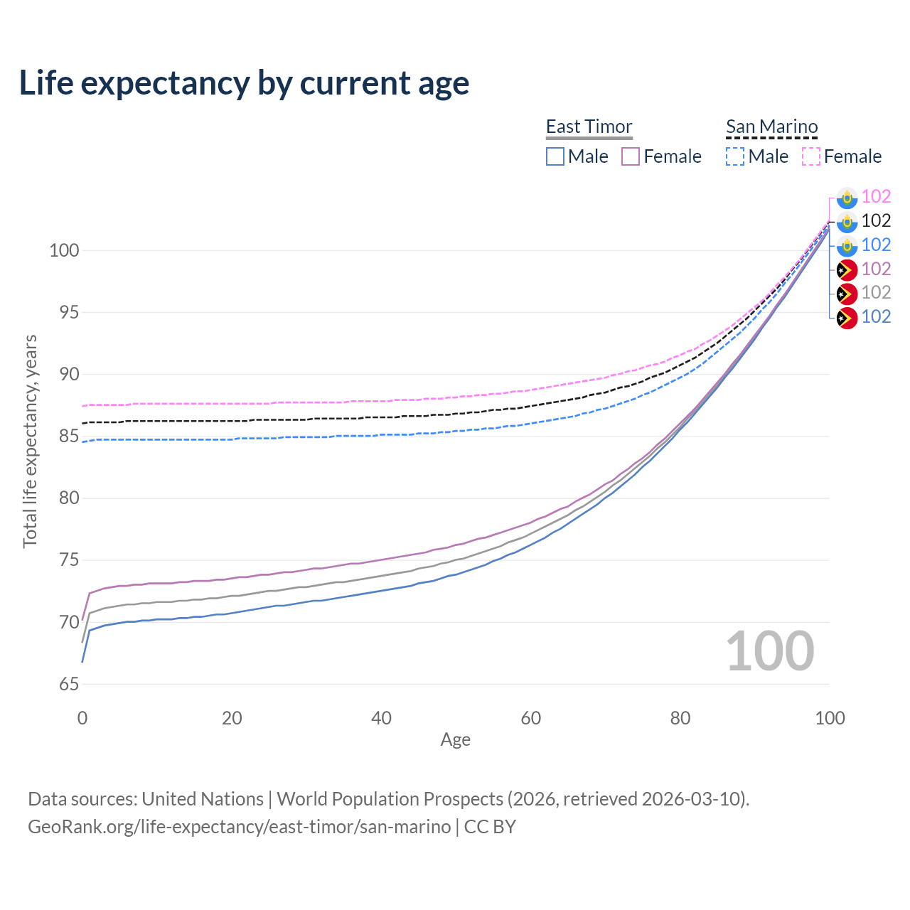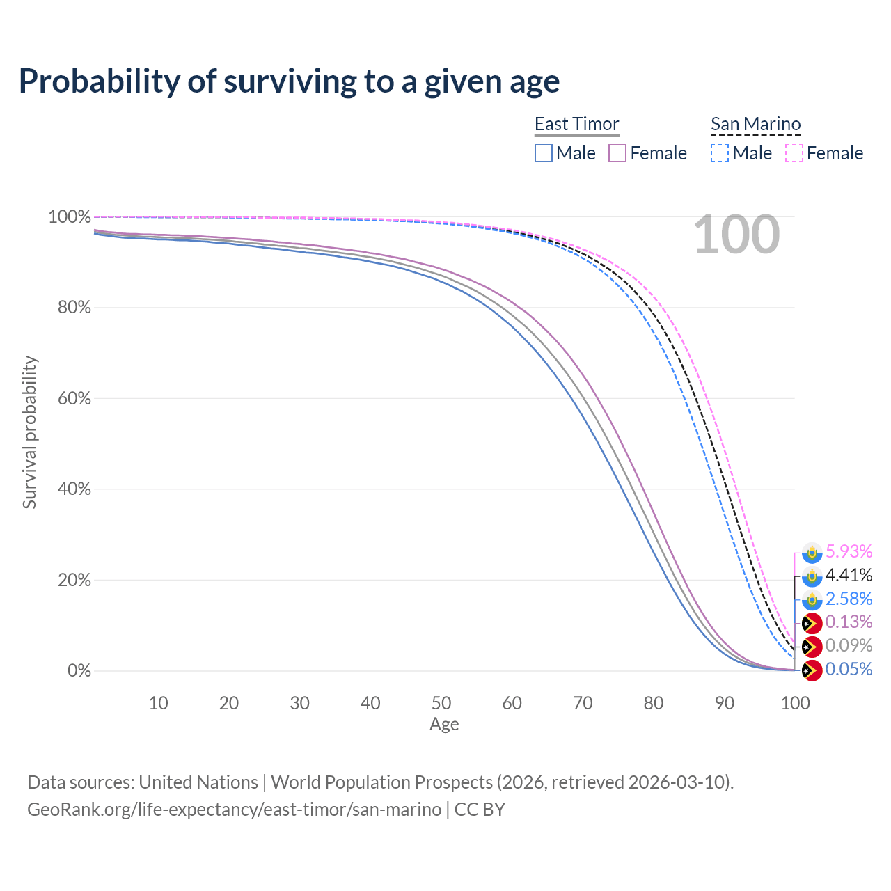 This life expectancy calculator shows the odds of living to 100, 95, 90, and below based on current age for both males and females in East Timor and San Marino, along with mean and median age of death. The calculations are based on the 2026 life tables (actuarial tables) from the UN World Population Prospects.