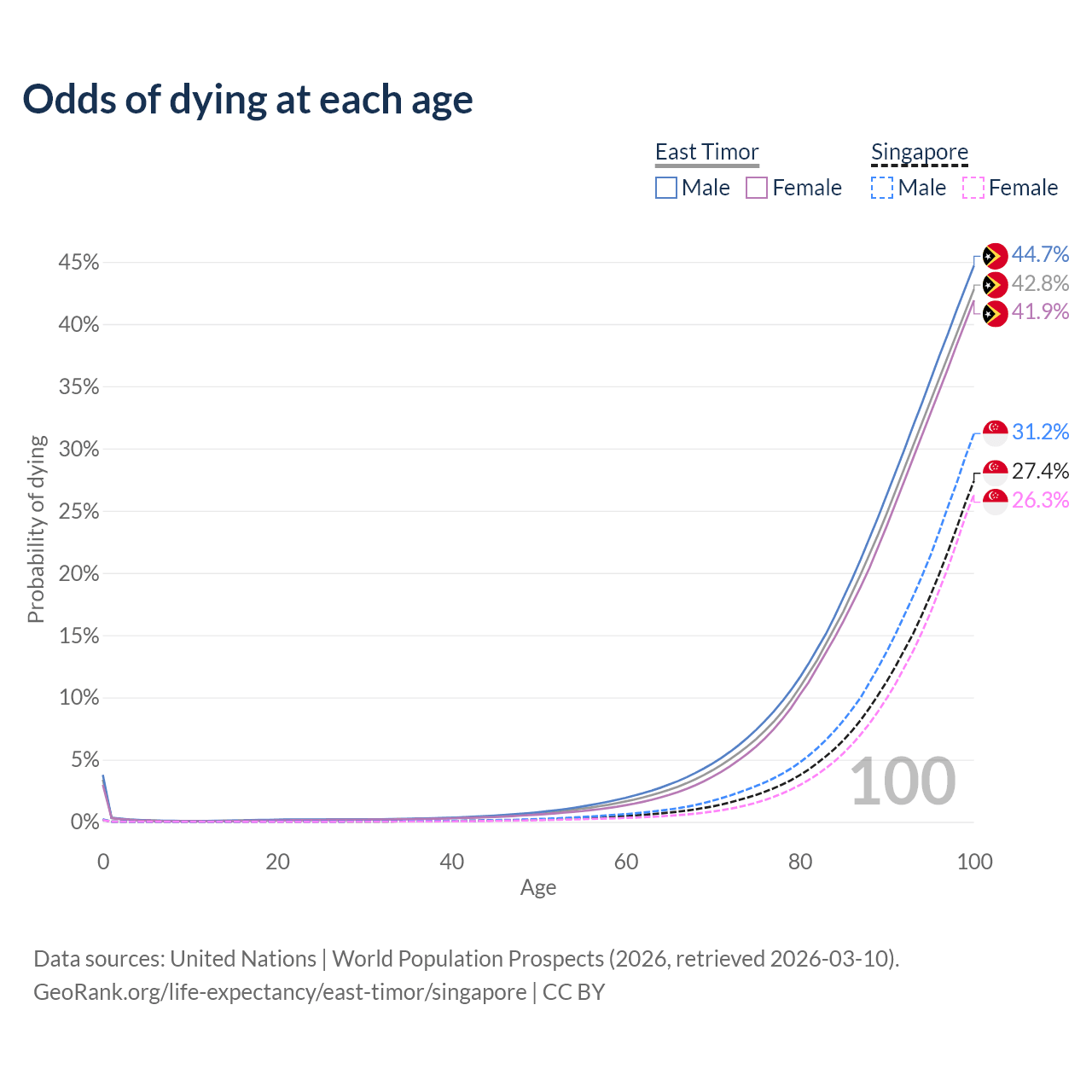 This life expectancy calculator shows the odds of living to 100, 95, 90, and below based on current age for both males and females in East Timor and Singapore, along with mean and median age of death. The calculations are based on the 2026 life tables (actuarial tables) from the UN World Population Prospects.