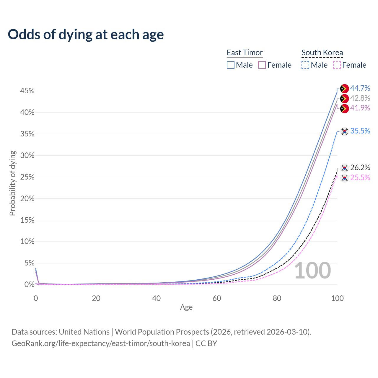 This life expectancy calculator shows the odds of living to 100, 95, 90, and below based on current age for both males and females in East Timor and South Korea, along with mean and median age of death. The calculations are based on the 2026 life tables (actuarial tables) from the UN World Population Prospects.