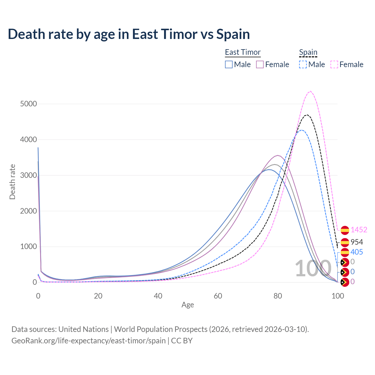 In East Timor, the most common age of death is 0, compared to 90 in Spain. The median age of death is 73.9 in East Timor and 87 in Spain, meaning only half of each cohort is expected to live past that age.