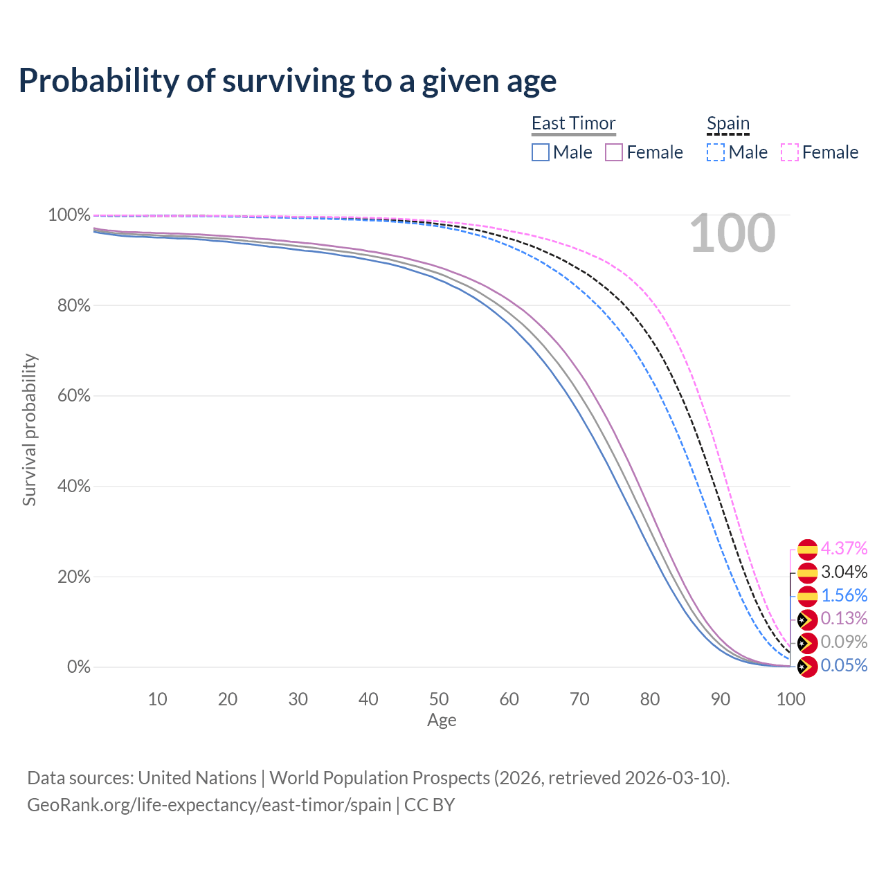 This life expectancy calculator shows the odds of living to 100, 95, 90, and below based on current age for both males and females in East Timor and Spain, along with mean and median age of death. The calculations are based on the 2026 life tables (actuarial tables) from the UN World Population Prospects.
