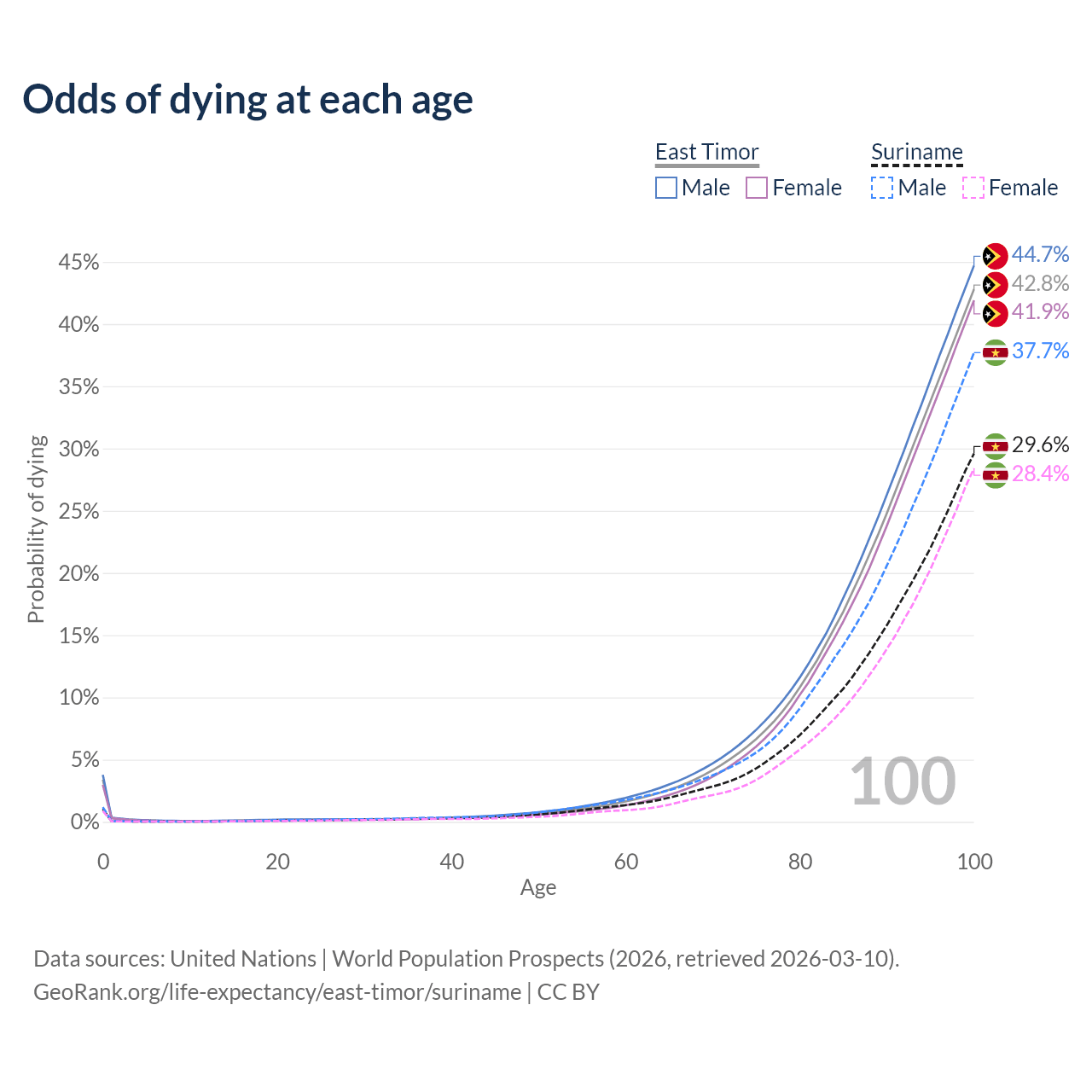 This life expectancy calculator shows the odds of living to 100, 95, 90, and below based on current age for both males and females in East Timor and Suriname, along with mean and median age of death. The calculations are based on the 2026 life tables (actuarial tables) from the UN World Population Prospects.