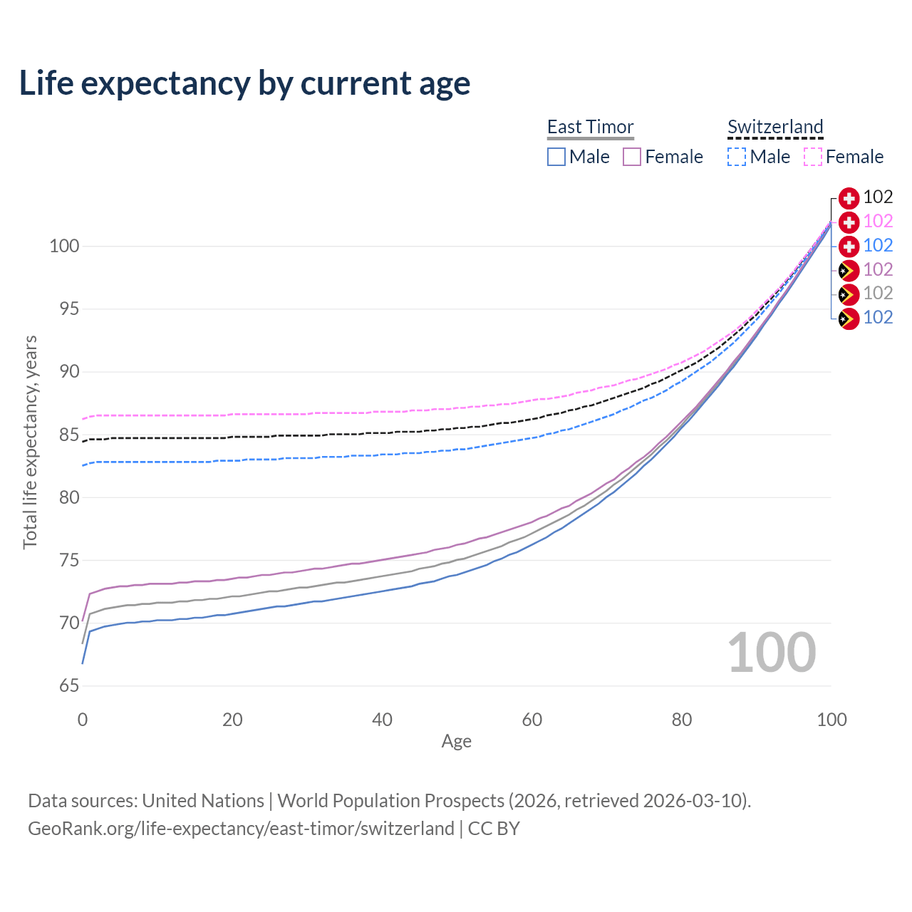This life expectancy calculator shows the odds of living to 100, 95, 90, and below based on current age for both males and females in East Timor and Switzerland, along with mean and median age of death. The calculations are based on the 2026 life tables (actuarial tables) from the UN World Population Prospects.