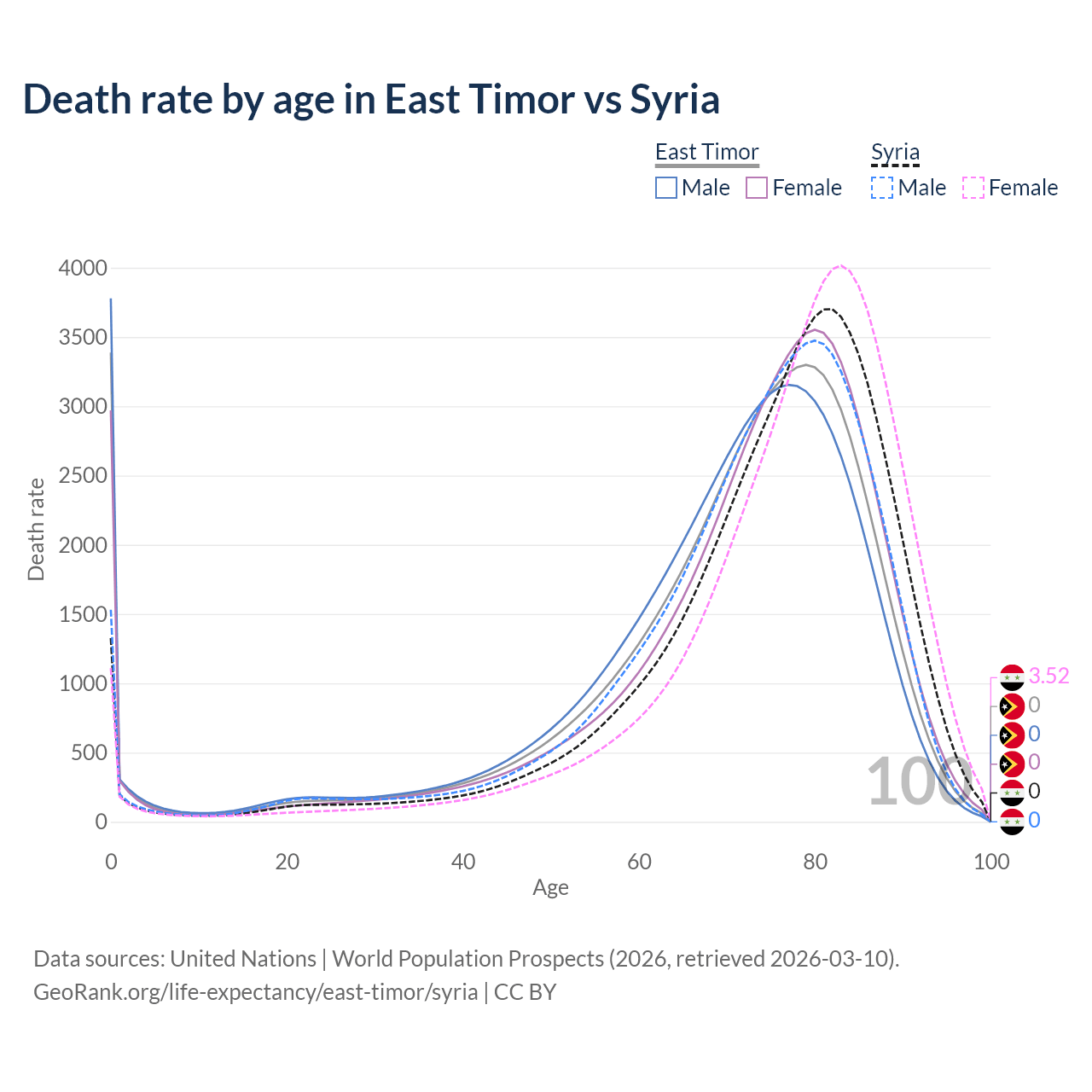 In East Timor, the most common age of death is 0, compared to 82 in Syria. The median age of death is 73.9 in East Timor and 77.7 in Syria, meaning only half of each cohort is expected to live past that age.