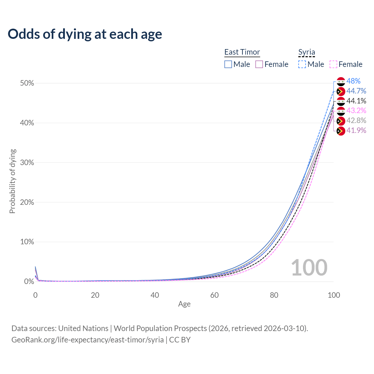 This life expectancy calculator shows the odds of living to 100, 95, 90, and below based on current age for both males and females in East Timor and Syria, along with mean and median age of death. The calculations are based on the 2026 life tables (actuarial tables) from the UN World Population Prospects.