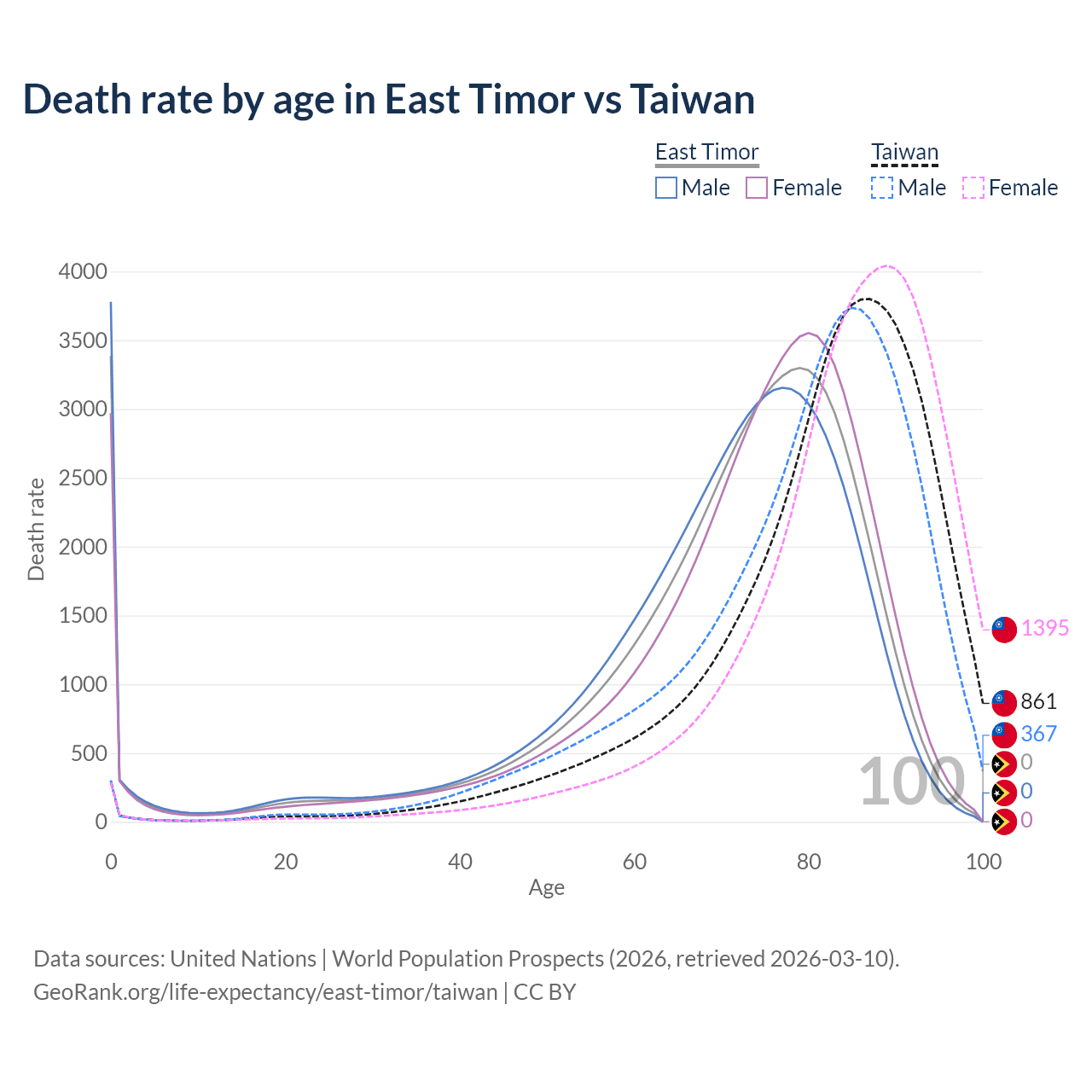In East Timor, the most common age of death is 0, compared to 87 in Taiwan. The median age of death is 73.9 in East Timor and 84.3 in Taiwan, meaning only half of each cohort is expected to live past that age.