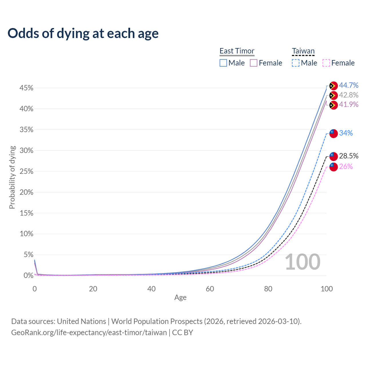 This life expectancy calculator shows the odds of living to 100, 95, 90, and below based on current age for both males and females in East Timor and Taiwan, along with mean and median age of death. The calculations are based on the 2026 life tables (actuarial tables) from the UN World Population Prospects.