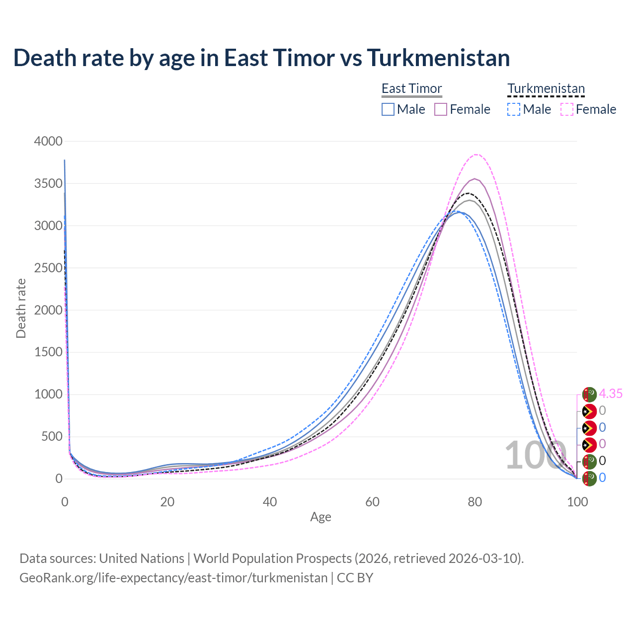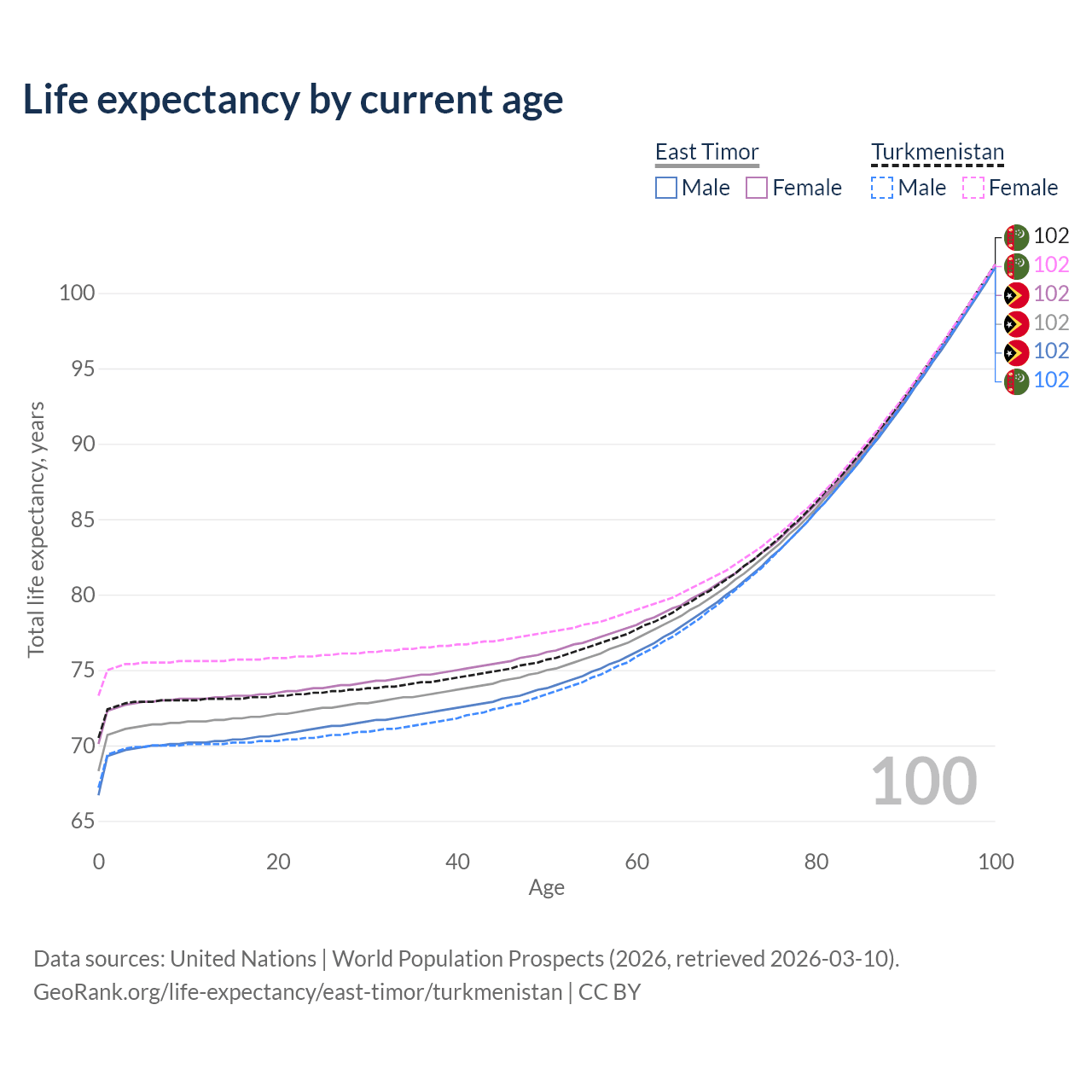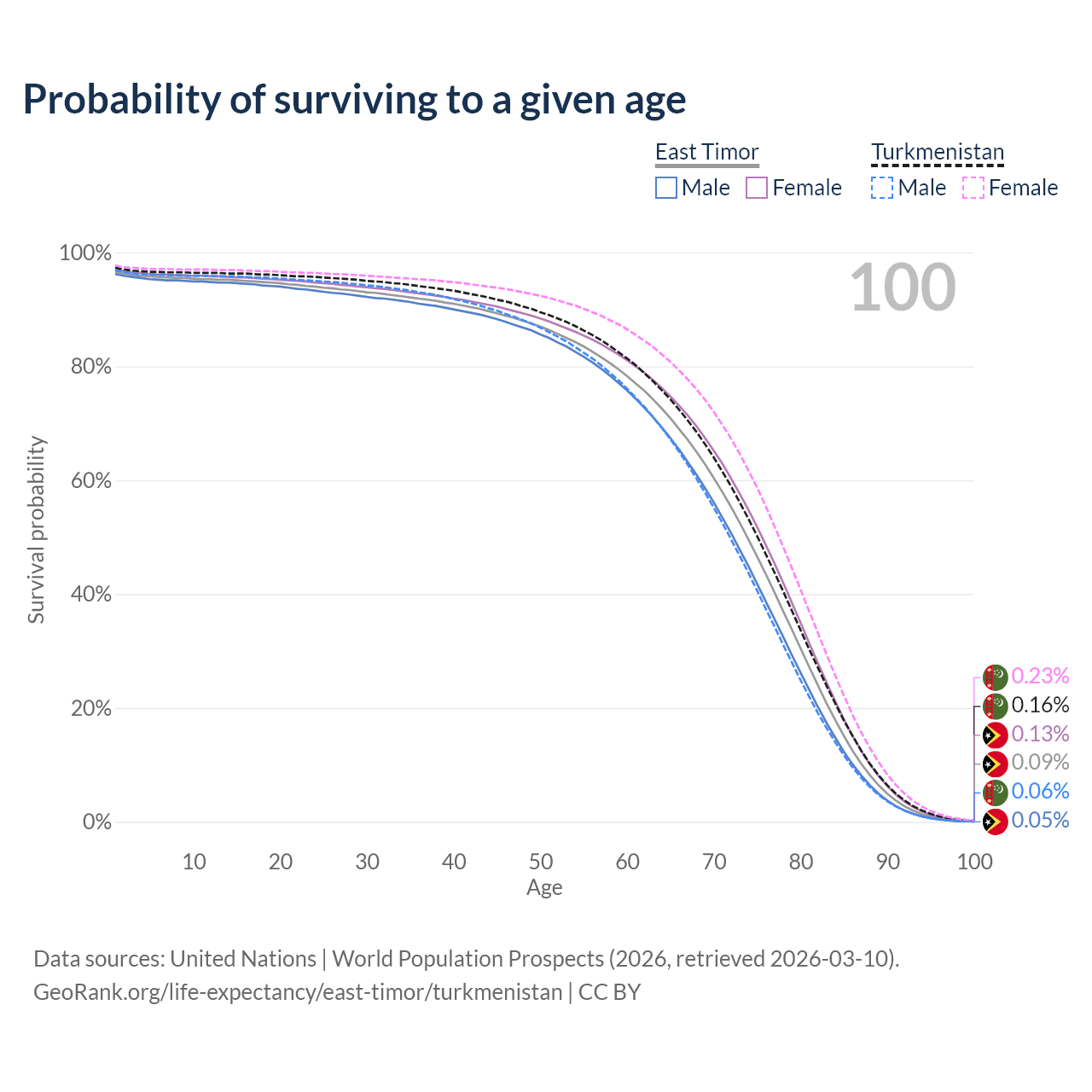 This life expectancy calculator shows the odds of living to 100, 95, 90, and below based on current age for both males and females in East Timor and Turkmenistan, along with mean and median age of death. The calculations are based on the 2026 life tables (actuarial tables) from the UN World Population Prospects.