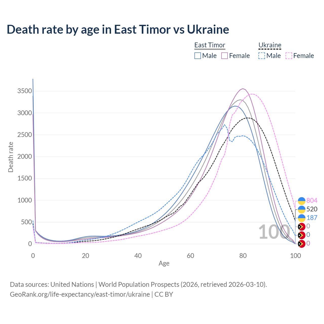 In East Timor, the most common age of death is 0, compared to 82 in Ukraine. The median age of death is 73.9 in East Timor and 78 in Ukraine, meaning only half of each cohort is expected to live past that age.