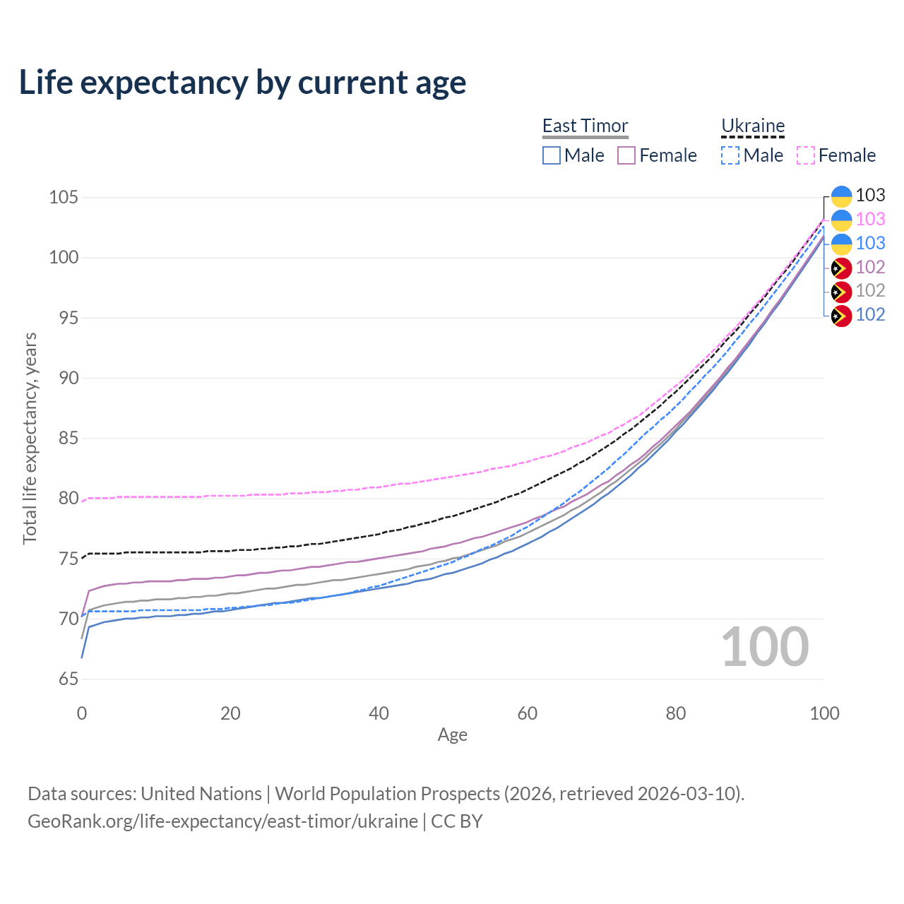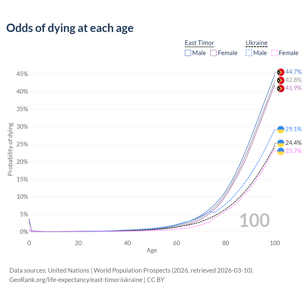 This life expectancy calculator shows the odds of living to 100, 95, 90, and below based on current age for both males and females in East Timor and Ukraine, along with mean and median age of death. The calculations are based on the 2026 life tables (actuarial tables) from the UN World Population Prospects.