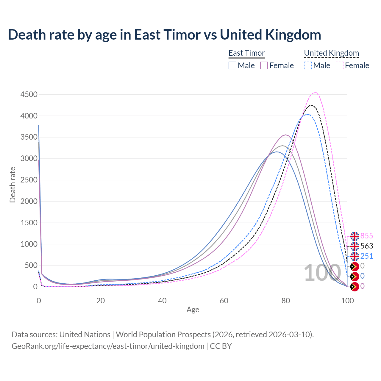 In East Timor, the most common age of death is 0, compared to 88 in the United Kingdom. The median age of death is 73.9 in East Timor and 84.9 in the United Kingdom, meaning only half of each cohort is expected to live past that age.