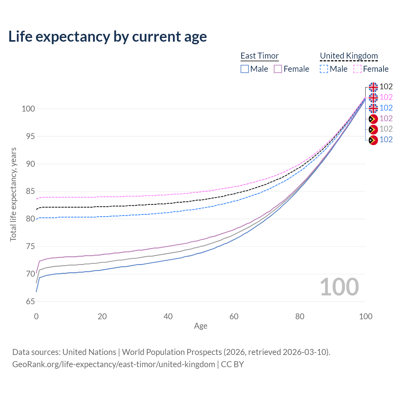 This life expectancy calculator shows the odds of living to 100, 95, 90, and below based on current age for both males and females in East Timor and the United Kingdom, along with mean and median age of death. The calculations are based on the 2026 life tables (actuarial tables) from the UN World Population Prospects.