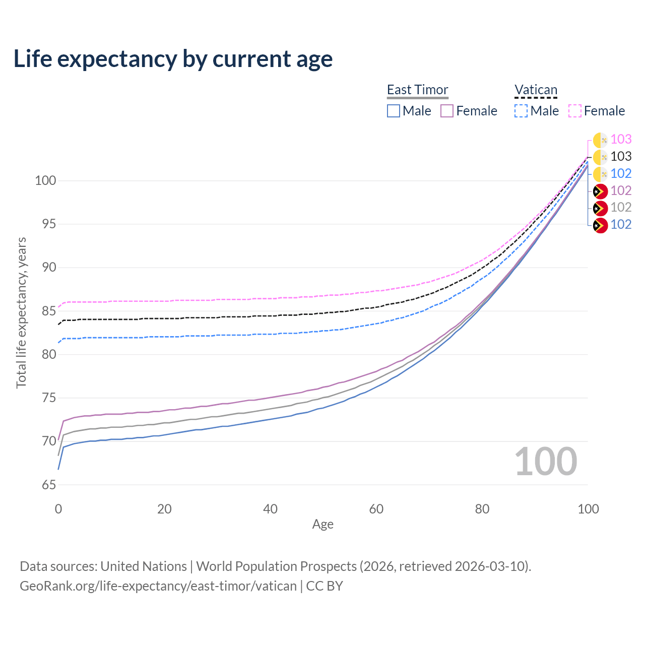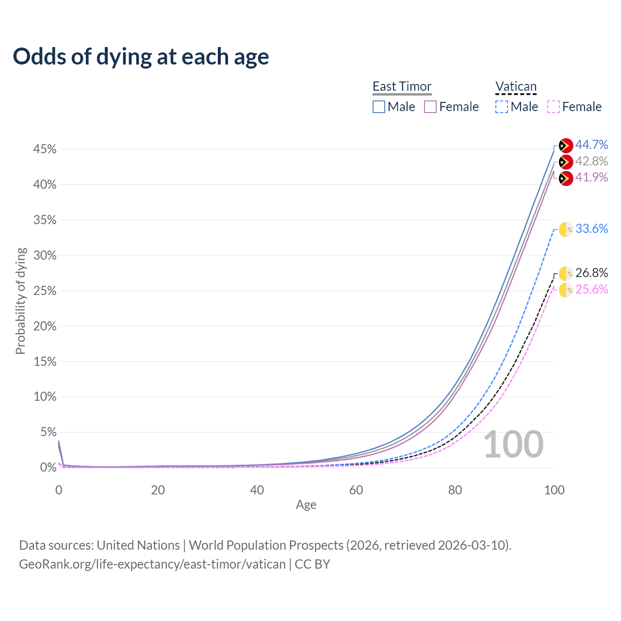 This life expectancy calculator shows the odds of living to 100, 95, 90, and below based on current age for both males and females in East Timor and the Vatican, along with mean and median age of death. The calculations are based on the 2026 life tables (actuarial tables) from the UN World Population Prospects.