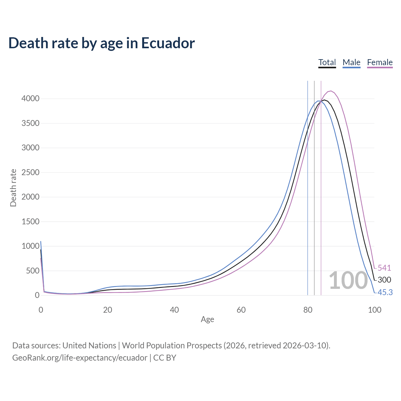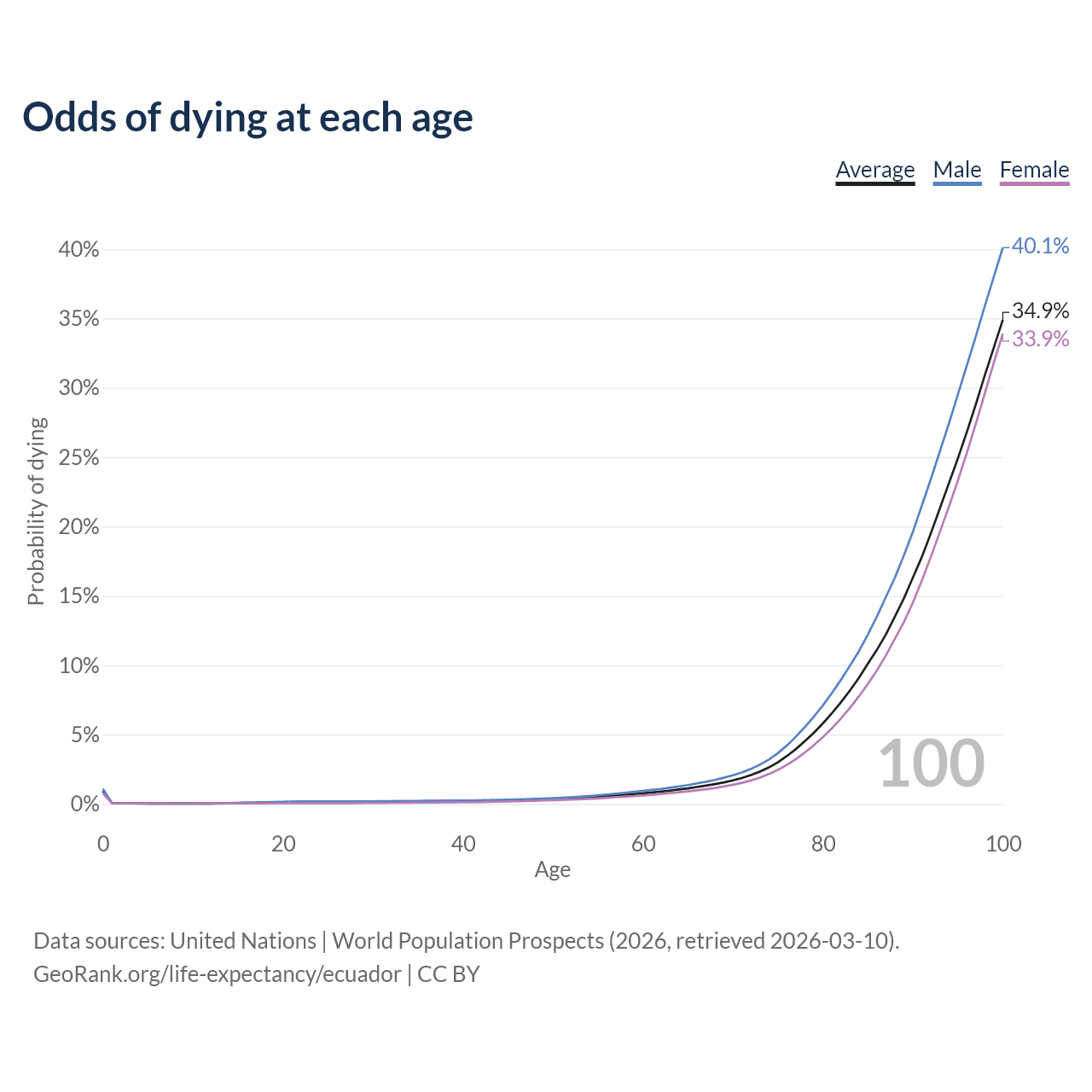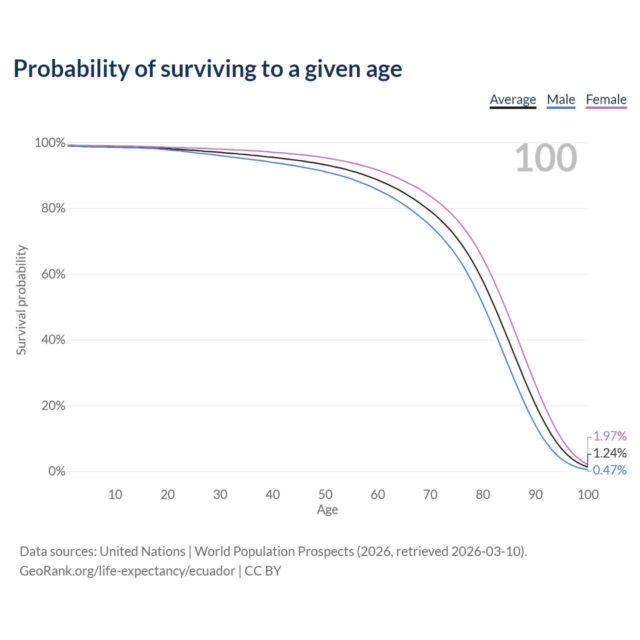 This life expectancy calculator shows the odds of living to 100, 95, 90, and below based on current age for both males and females in Ecuador, along with mean and median age of death. The calculations are based on the 2026 life tables (actuarial tables) from the UN World Population Prospects.