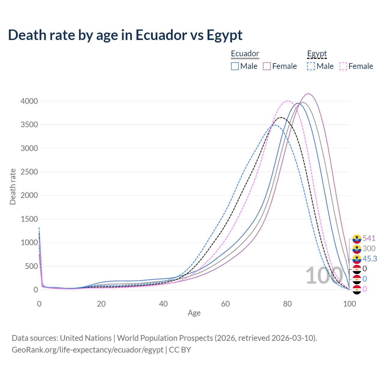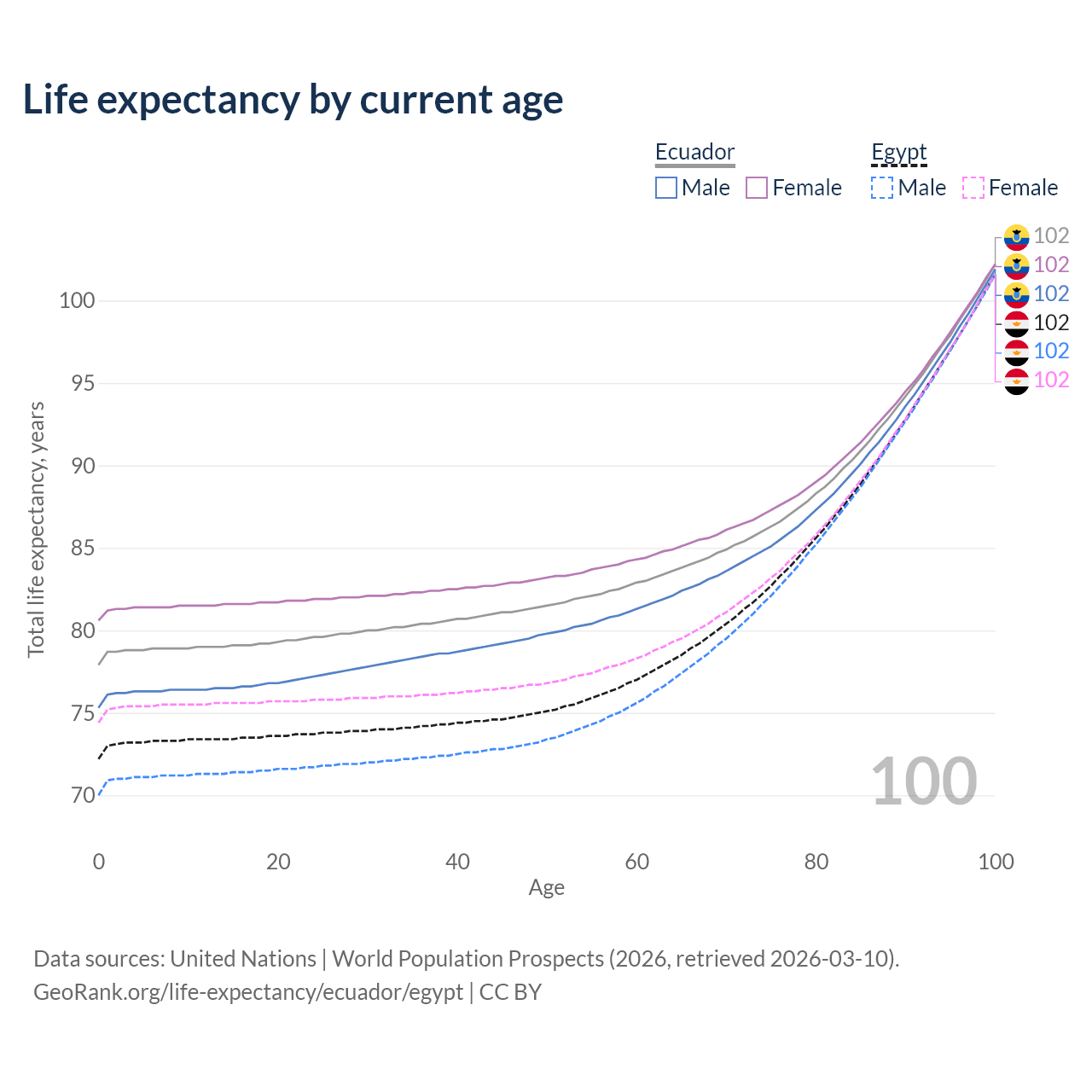 This life expectancy calculator shows the odds of living to 100, 95, 90, and below based on current age for both males and females in Ecuador and Egypt, along with mean and median age of death. The calculations are based on the 2026 life tables (actuarial tables) from the UN World Population Prospects.