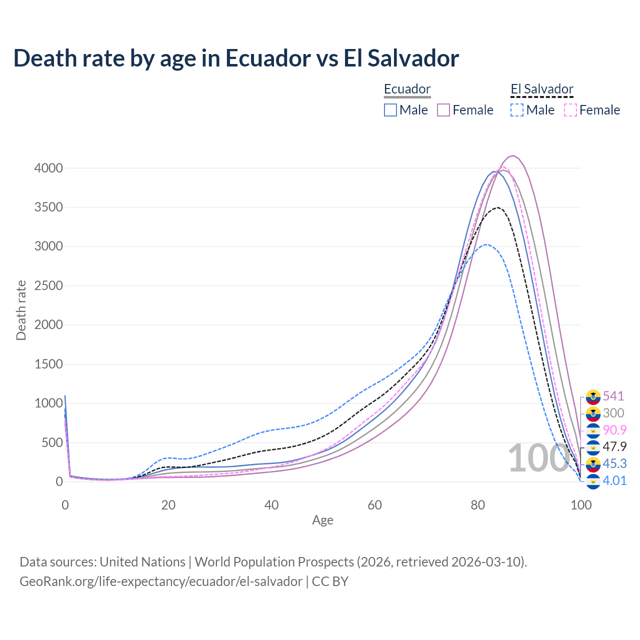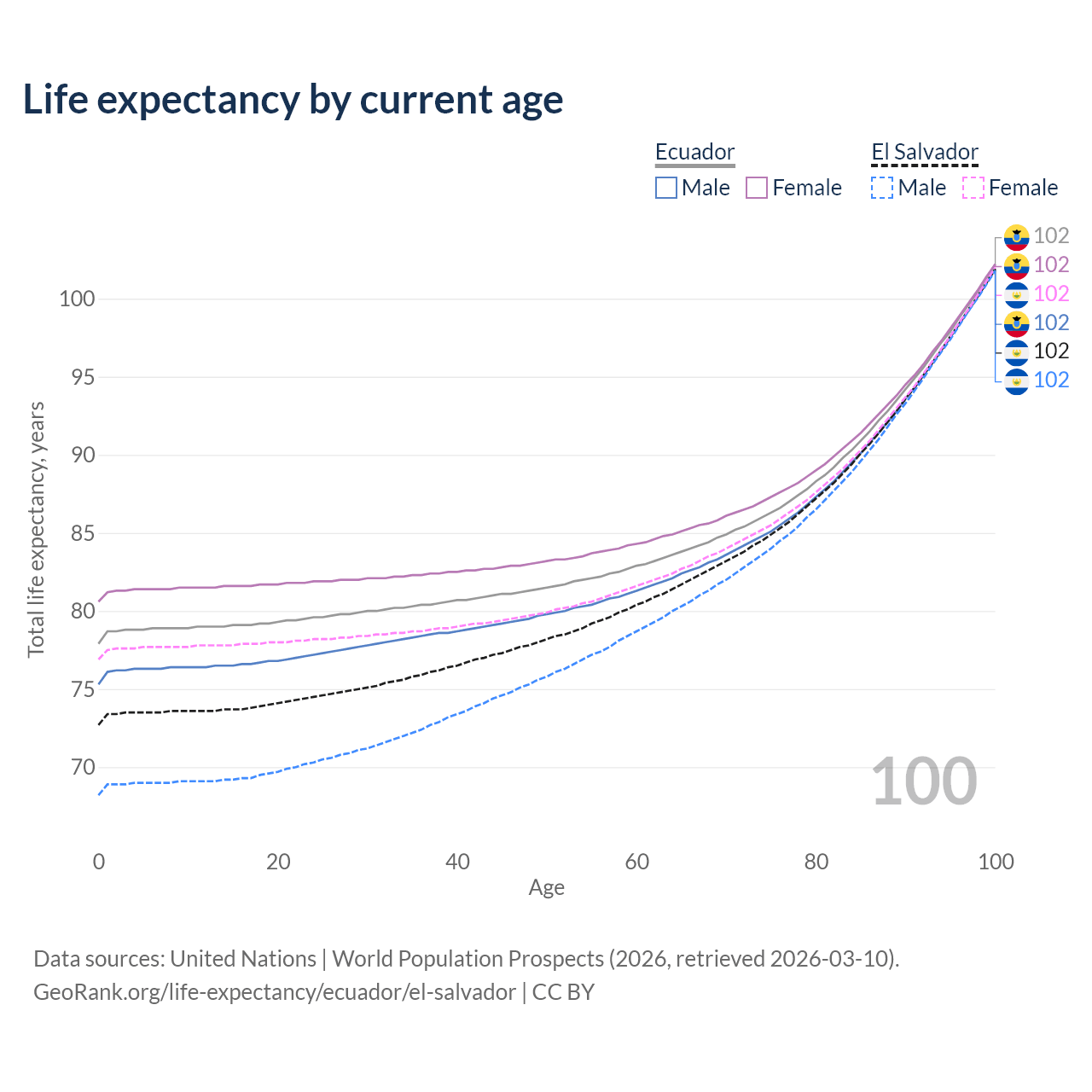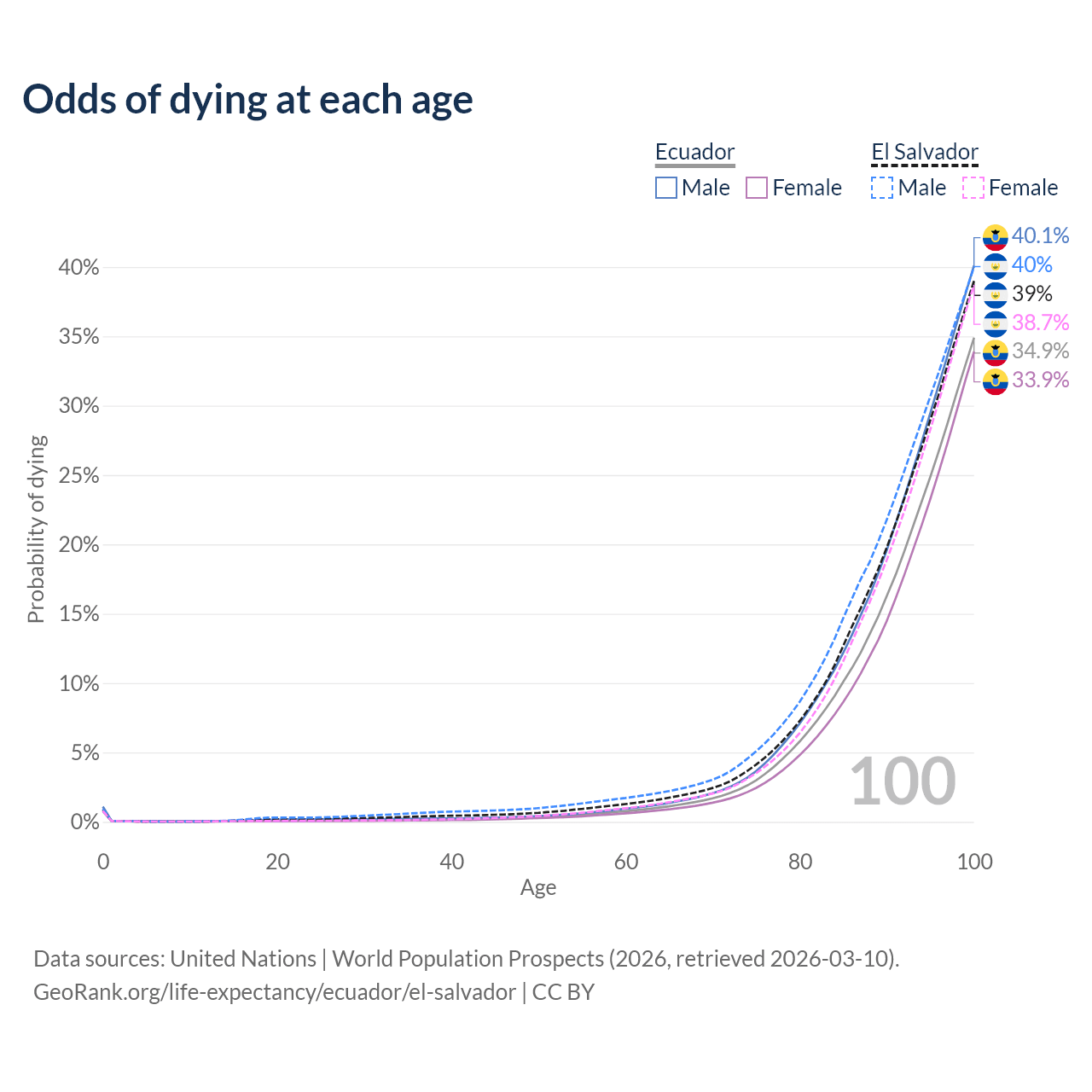 This life expectancy calculator shows the odds of living to 100, 95, 90, and below based on current age for both males and females in Ecuador and El Salvador, along with mean and median age of death. The calculations are based on the 2026 life tables (actuarial tables) from the UN World Population Prospects.