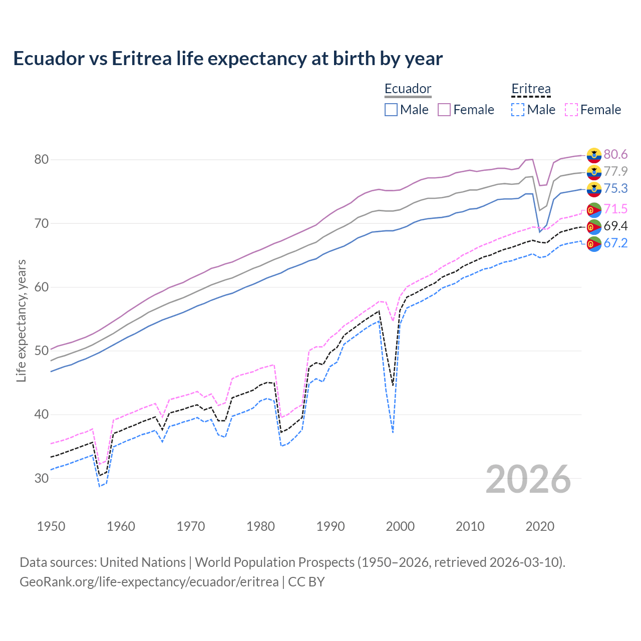 The average life expectancy at birth is 77.9 years in Ecuador vs 69.4 in Eritrea. Ecuador is ranked 65/197 by life expectancy, and Eritrea is 142/197. In Ecuador, the life expectancy is 75.3 years for males and 80.6 years for females. In Eritrea, it's 67.2 years for males and 71.5 years for females.
