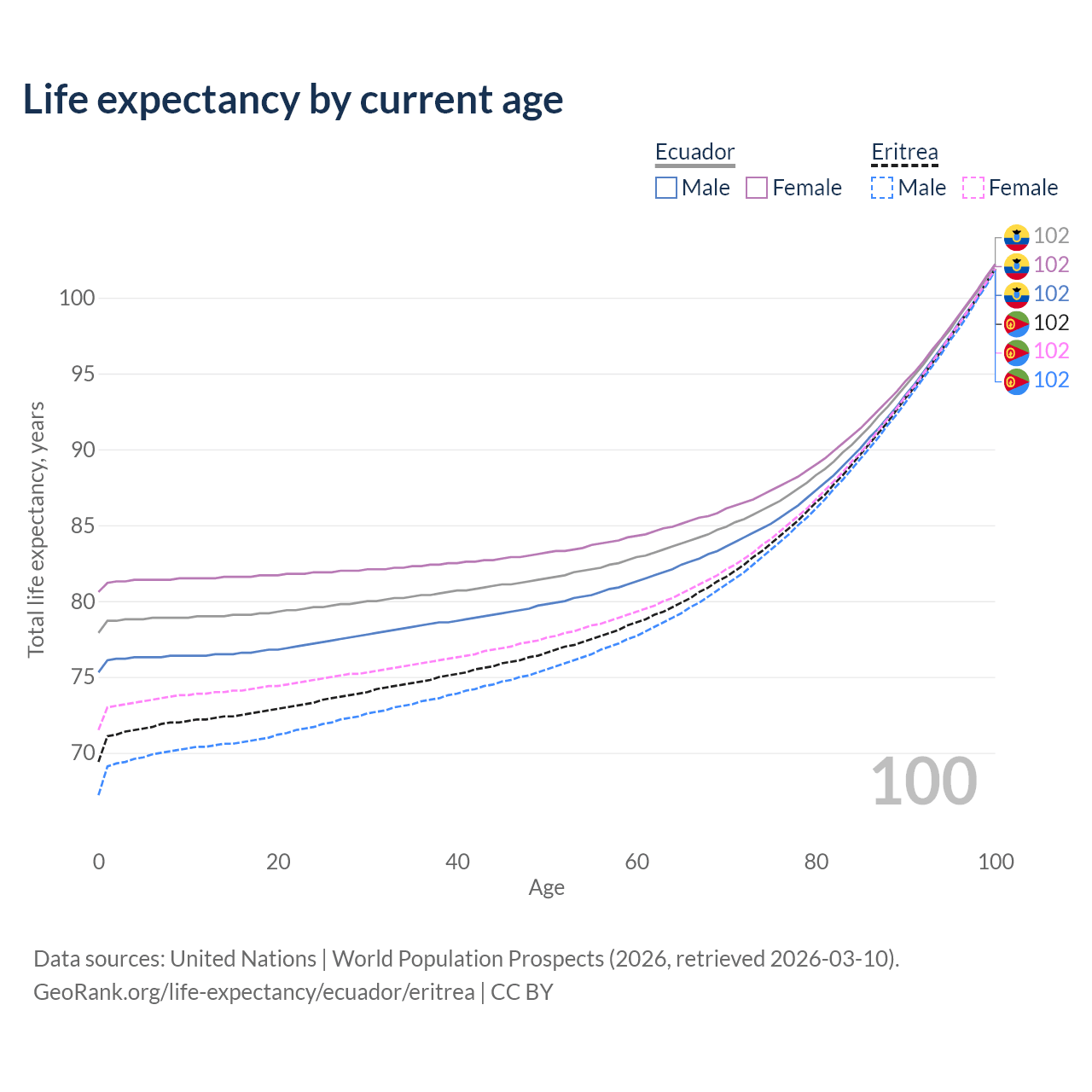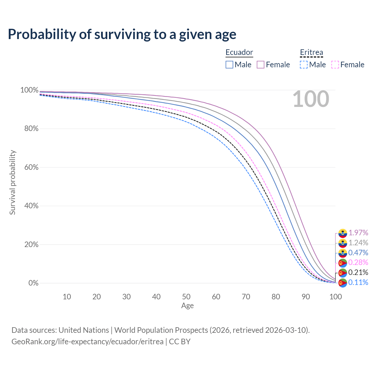 This life expectancy calculator shows the odds of living to 100, 95, 90, and below based on current age for both males and females in Ecuador and Eritrea, along with mean and median age of death. The calculations are based on the 2026 life tables (actuarial tables) from the UN World Population Prospects.