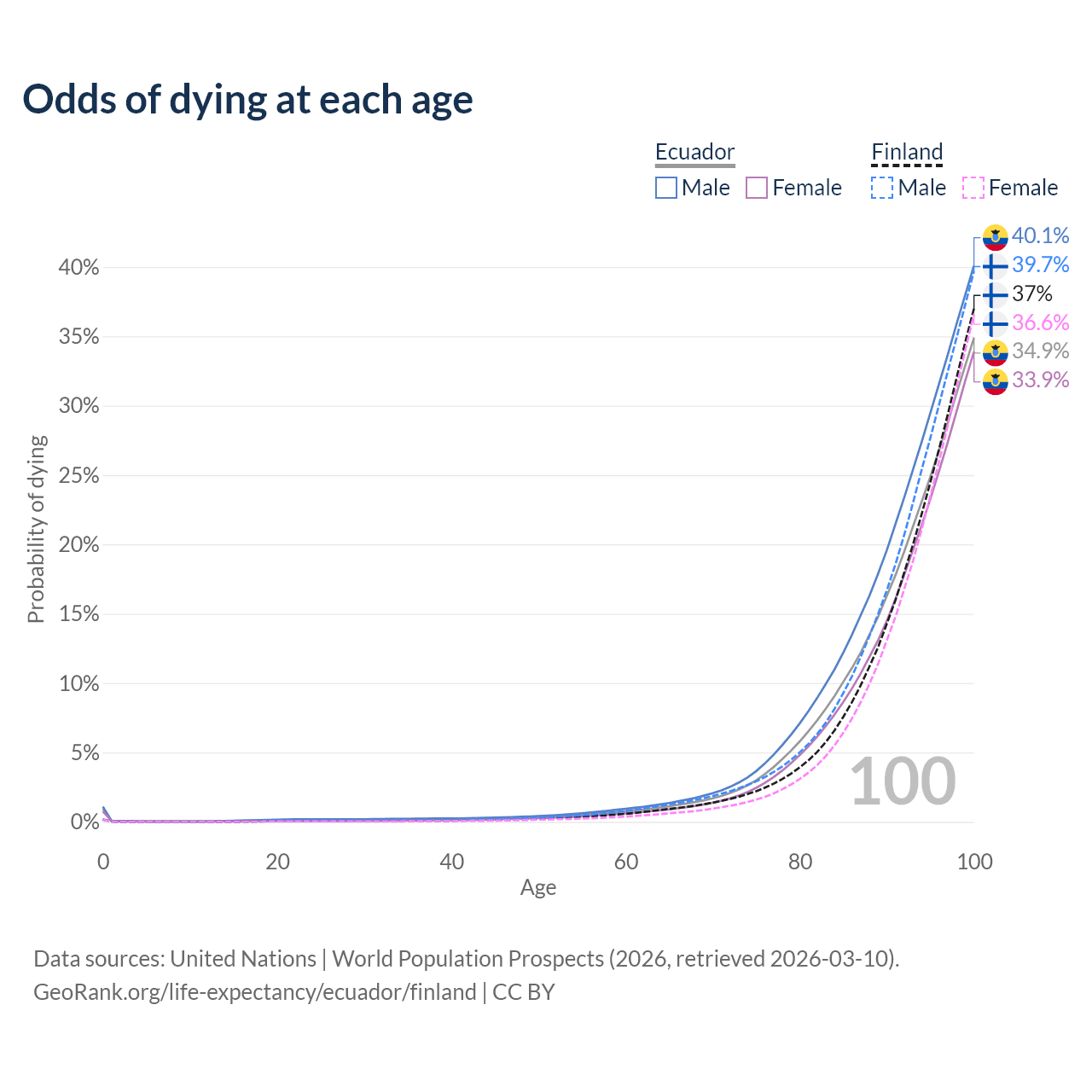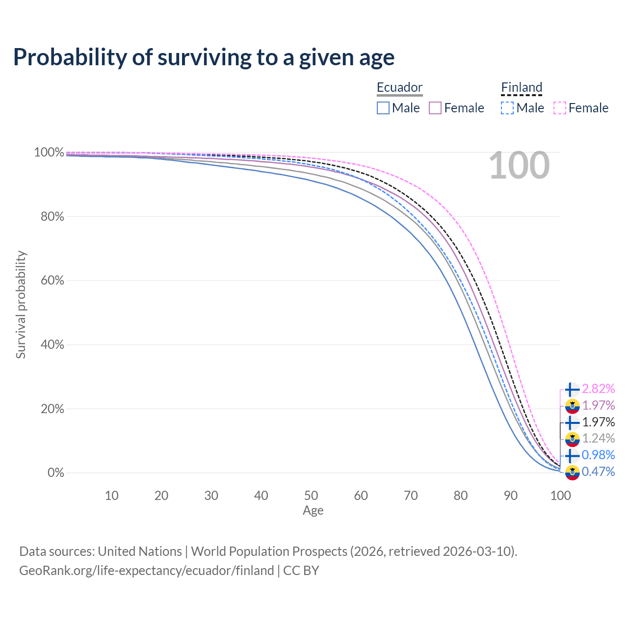 This life expectancy calculator shows the odds of living to 100, 95, 90, and below based on current age for both males and females in Ecuador and Finland, along with mean and median age of death. The calculations are based on the 2026 life tables (actuarial tables) from the UN World Population Prospects.