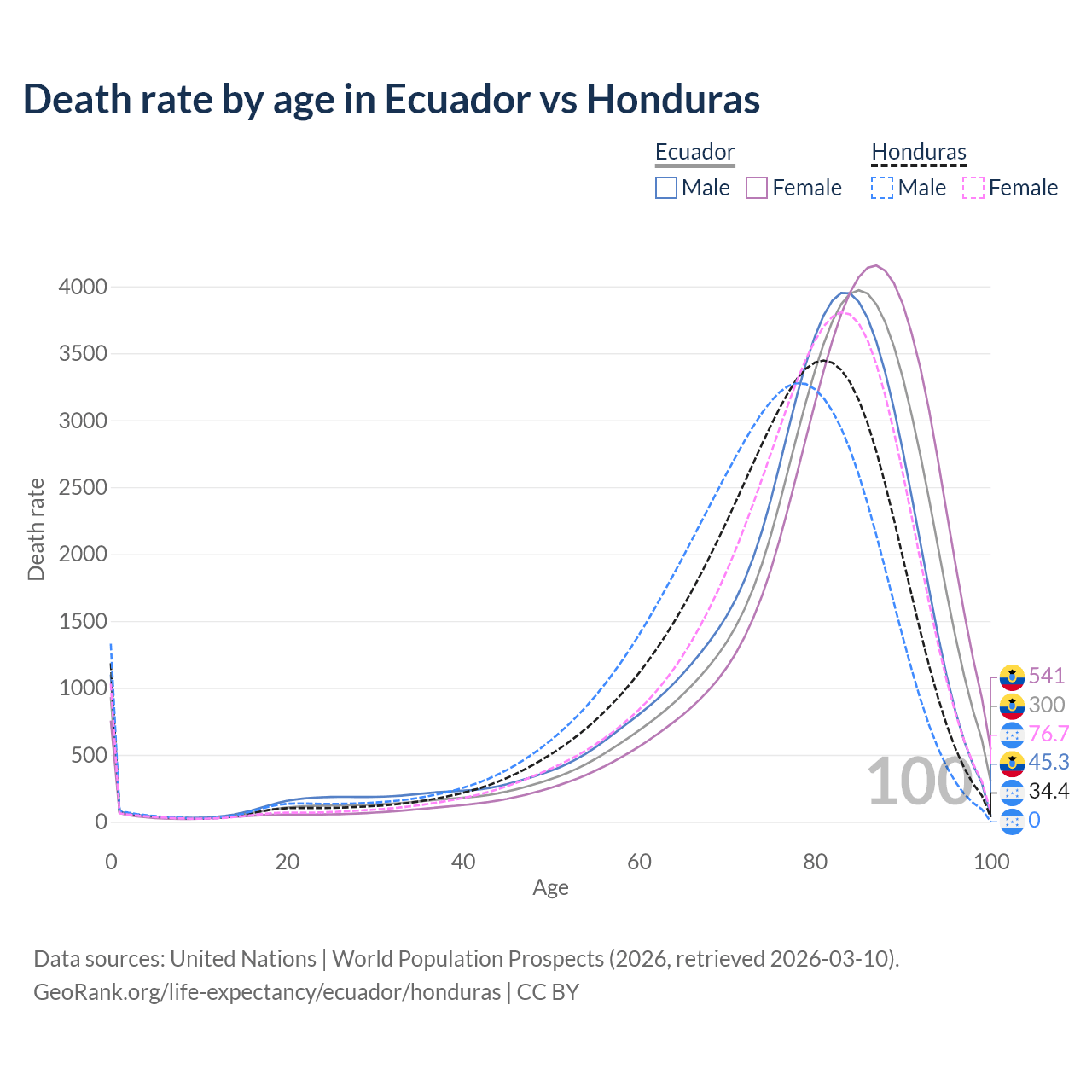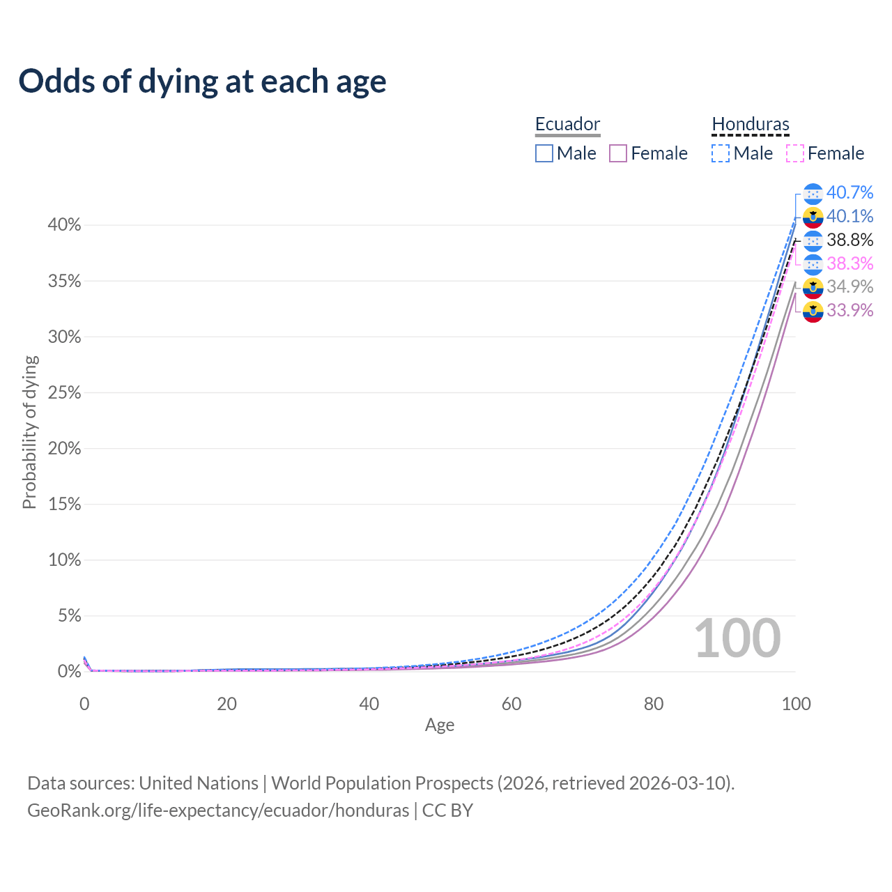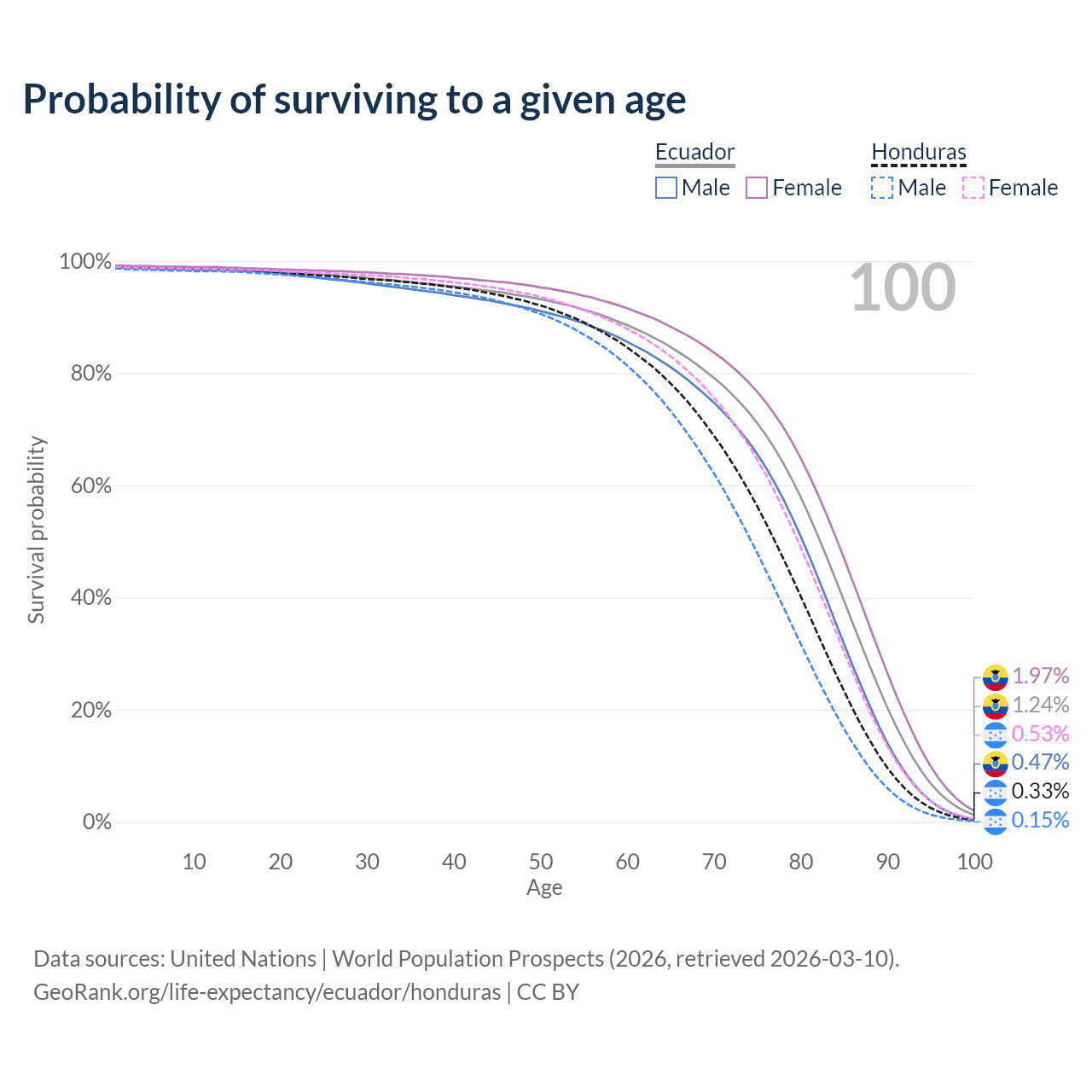 This life expectancy calculator shows the odds of living to 100, 95, 90, and below based on current age for both males and females in Ecuador and Honduras, along with mean and median age of death. The calculations are based on the 2026 life tables (actuarial tables) from the UN World Population Prospects.