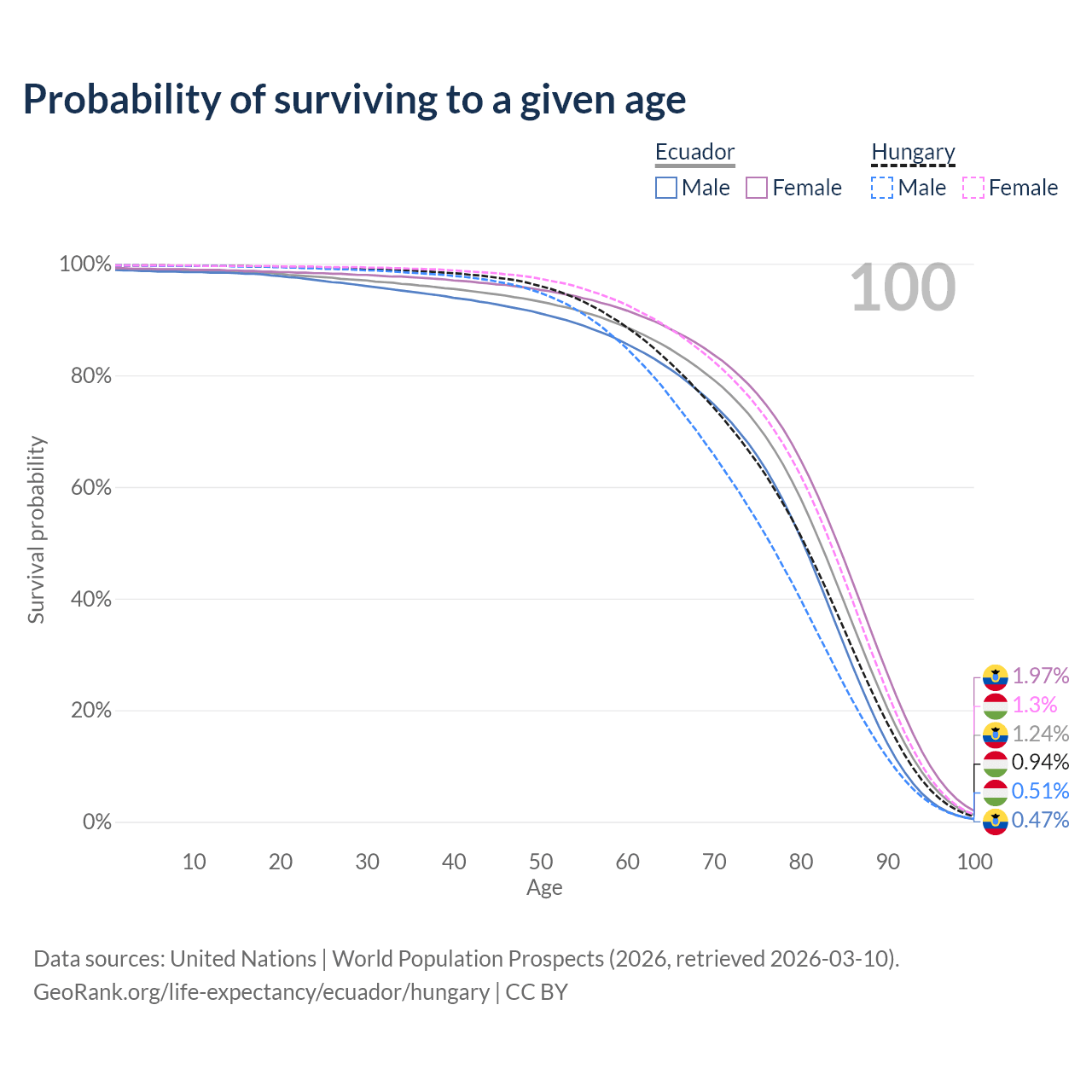 This life expectancy calculator shows the odds of living to 100, 95, 90, and below based on current age for both males and females in Ecuador and Hungary, along with mean and median age of death. The calculations are based on the 2026 life tables (actuarial tables) from the UN World Population Prospects.