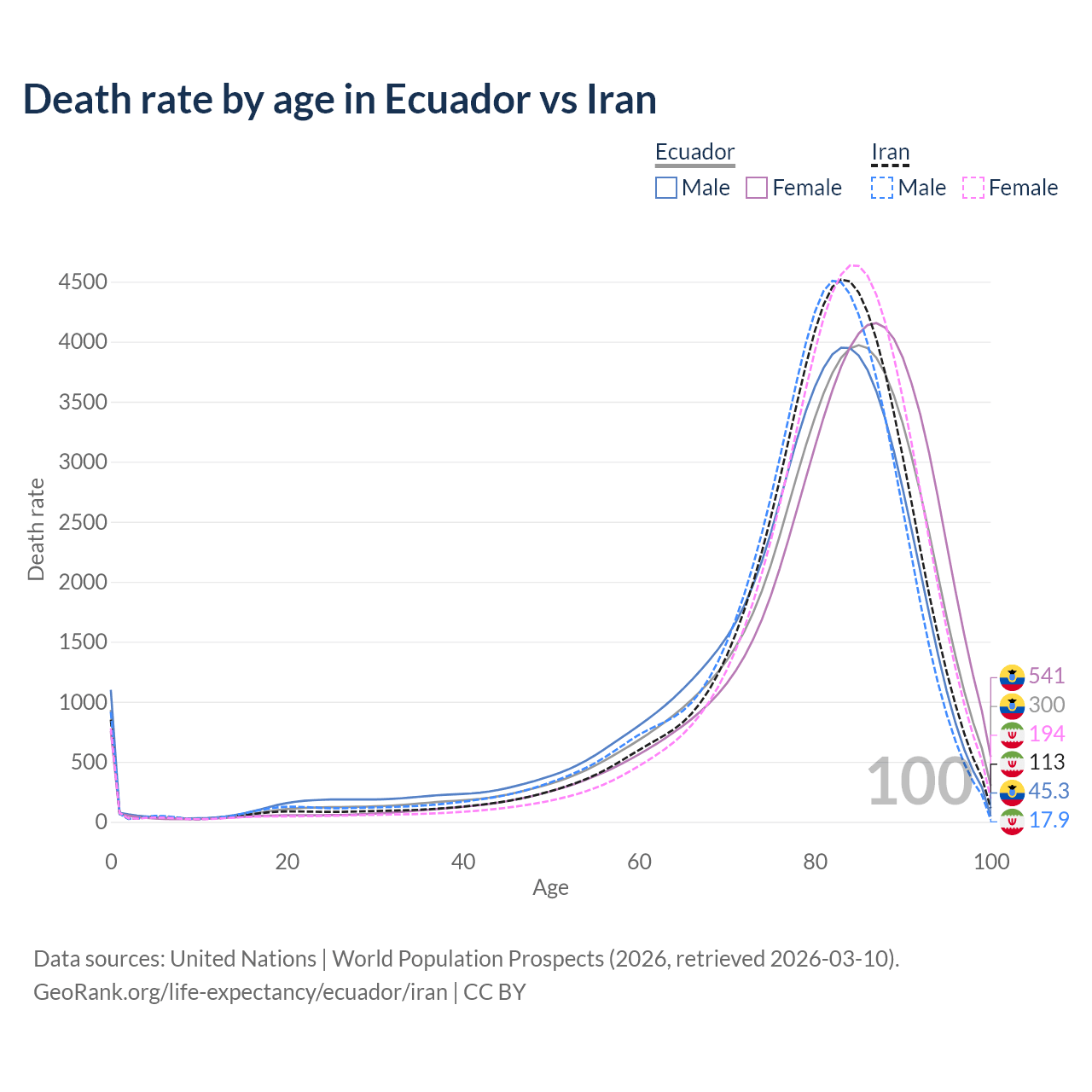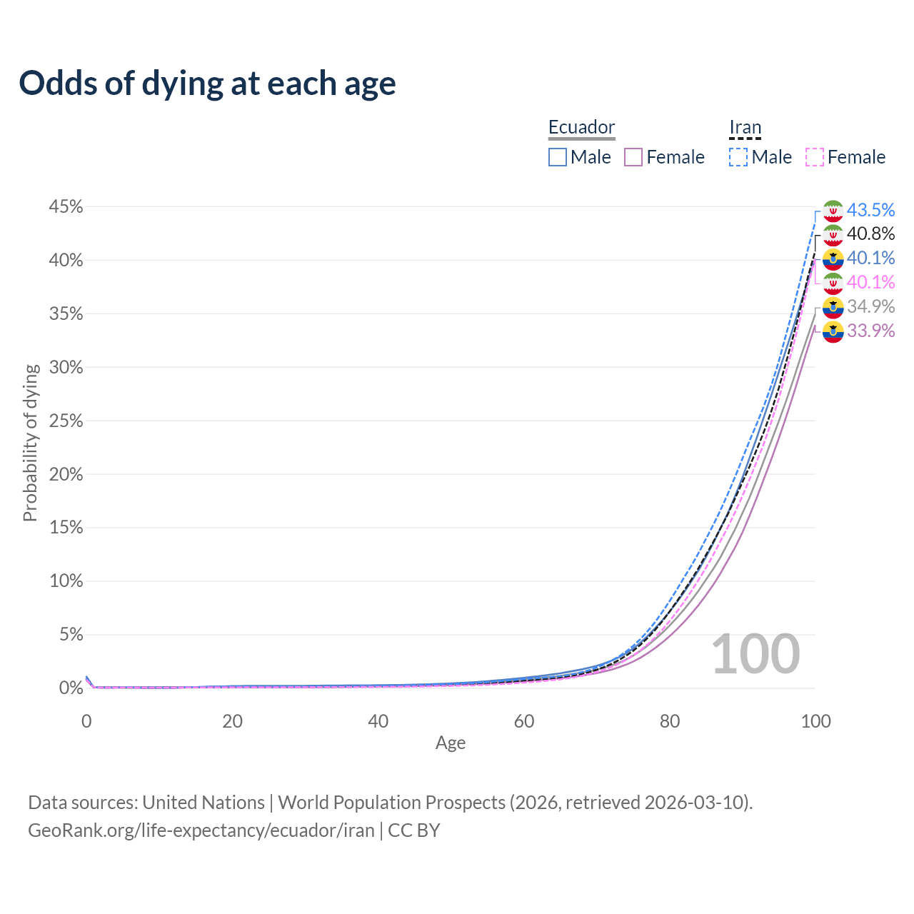 This life expectancy calculator shows the odds of living to 100, 95, 90, and below based on current age for both males and females in Ecuador and Iran, along with mean and median age of death. The calculations are based on the 2026 life tables (actuarial tables) from the UN World Population Prospects.
