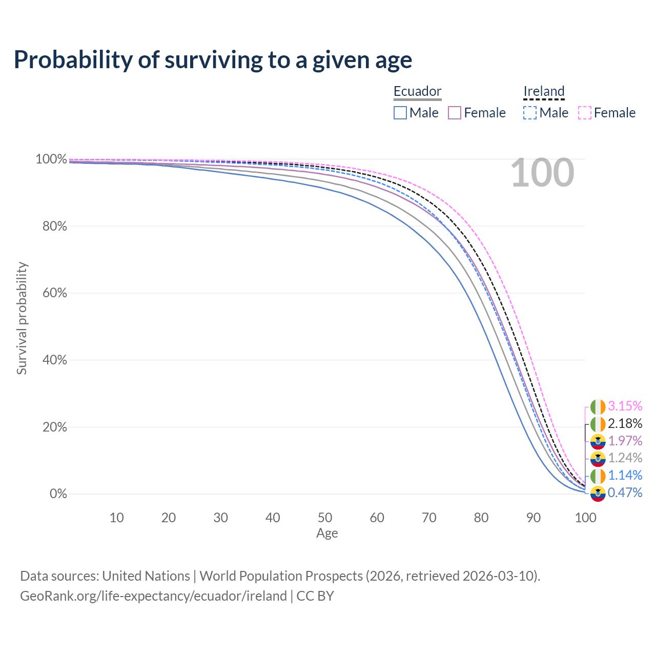 This life expectancy calculator shows the odds of living to 100, 95, 90, and below based on current age for both males and females in Ecuador and Ireland, along with mean and median age of death. The calculations are based on the 2026 life tables (actuarial tables) from the UN World Population Prospects.
