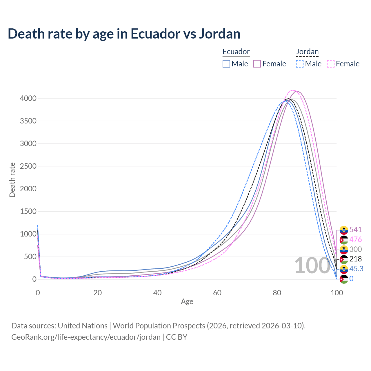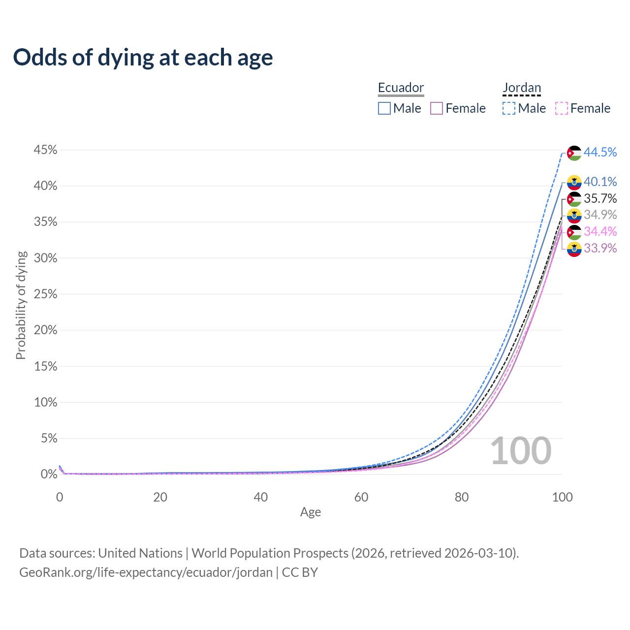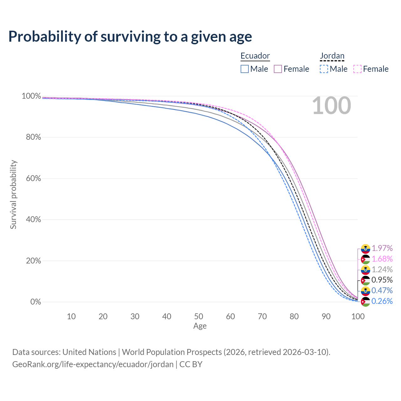 This life expectancy calculator shows the odds of living to 100, 95, 90, and below based on current age for both males and females in Ecuador and Jordan, along with mean and median age of death. The calculations are based on the 2026 life tables (actuarial tables) from the UN World Population Prospects.