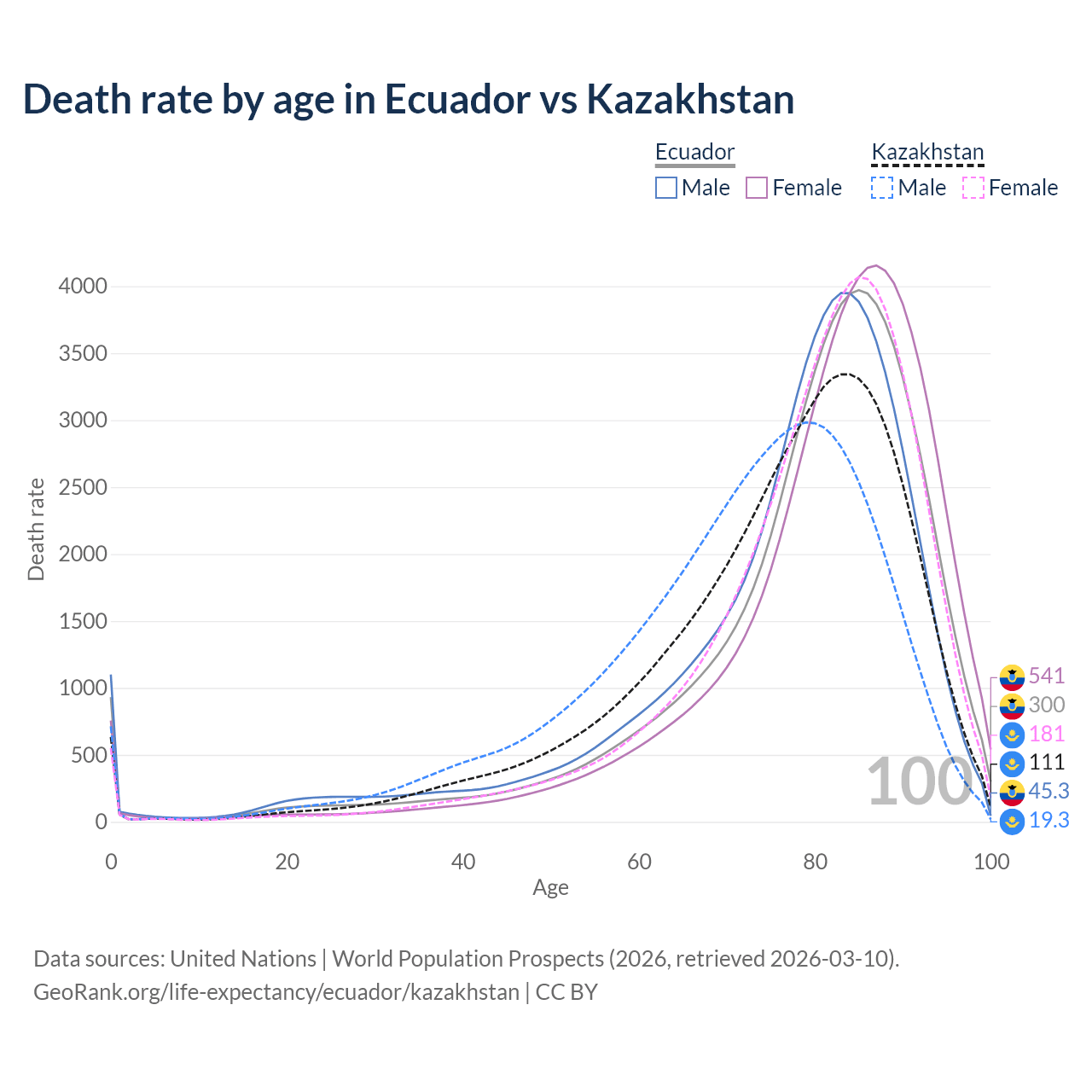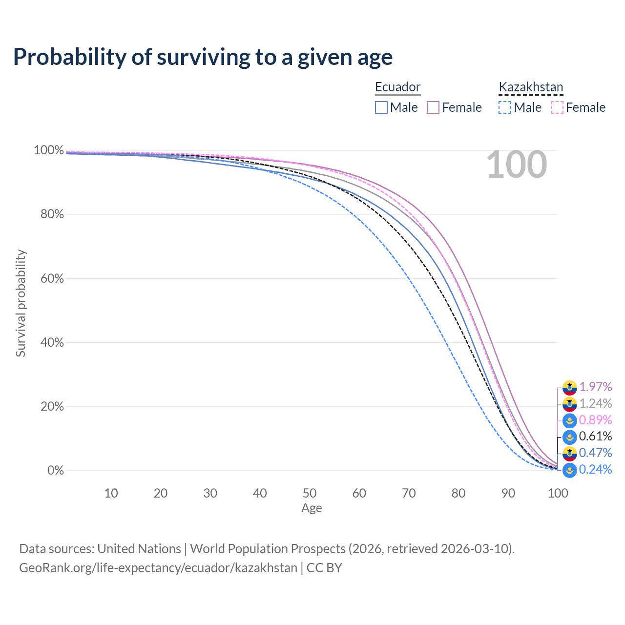 This life expectancy calculator shows the odds of living to 100, 95, 90, and below based on current age for both males and females in Ecuador and Kazakhstan, along with mean and median age of death. The calculations are based on the 2026 life tables (actuarial tables) from the UN World Population Prospects.