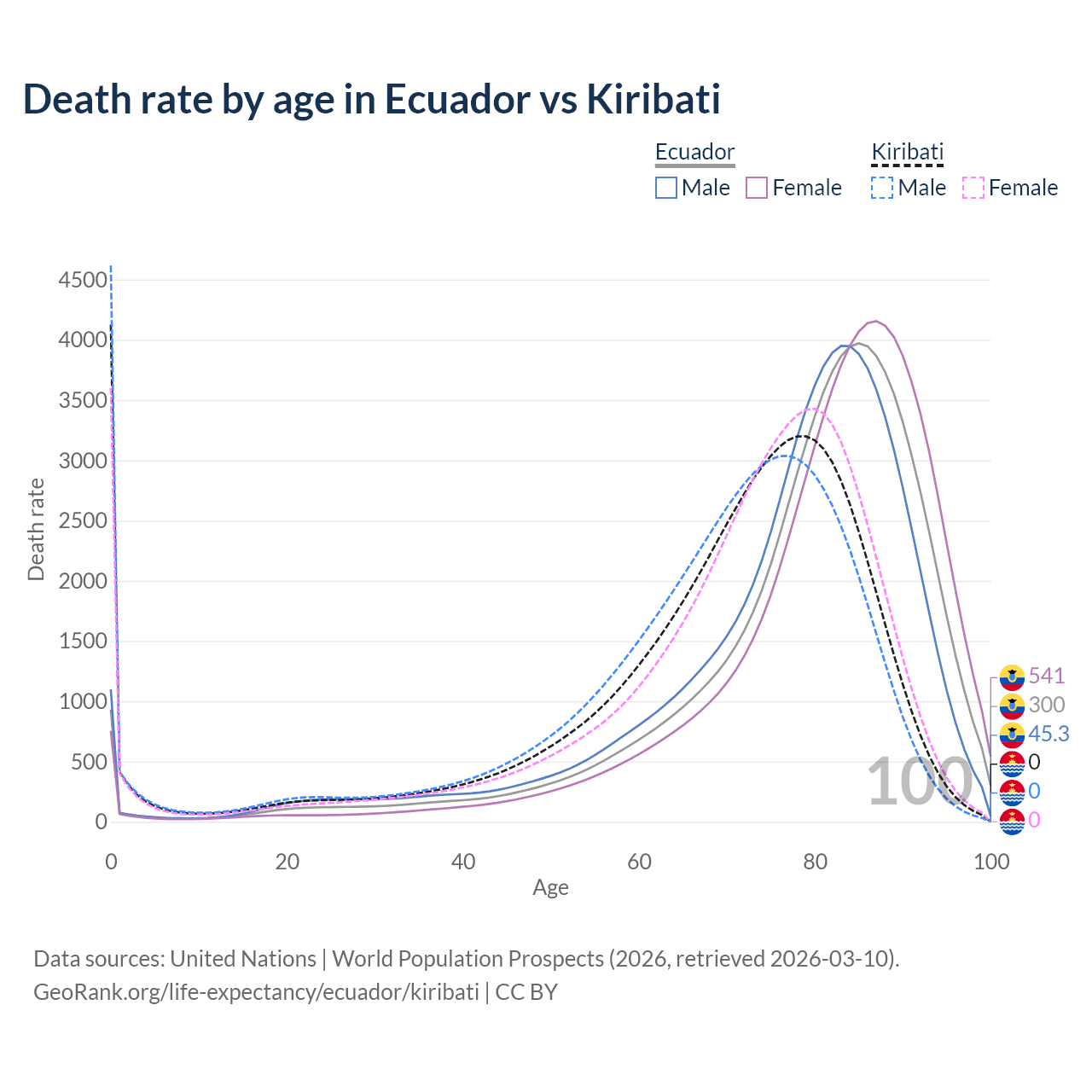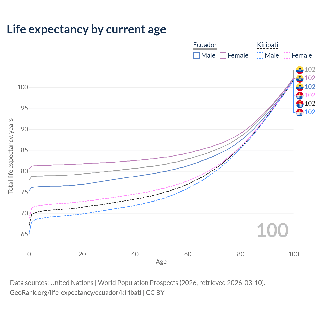 This life expectancy calculator shows the odds of living to 100, 95, 90, and below based on current age for both males and females in Ecuador and Kiribati, along with mean and median age of death. The calculations are based on the 2026 life tables (actuarial tables) from the UN World Population Prospects.