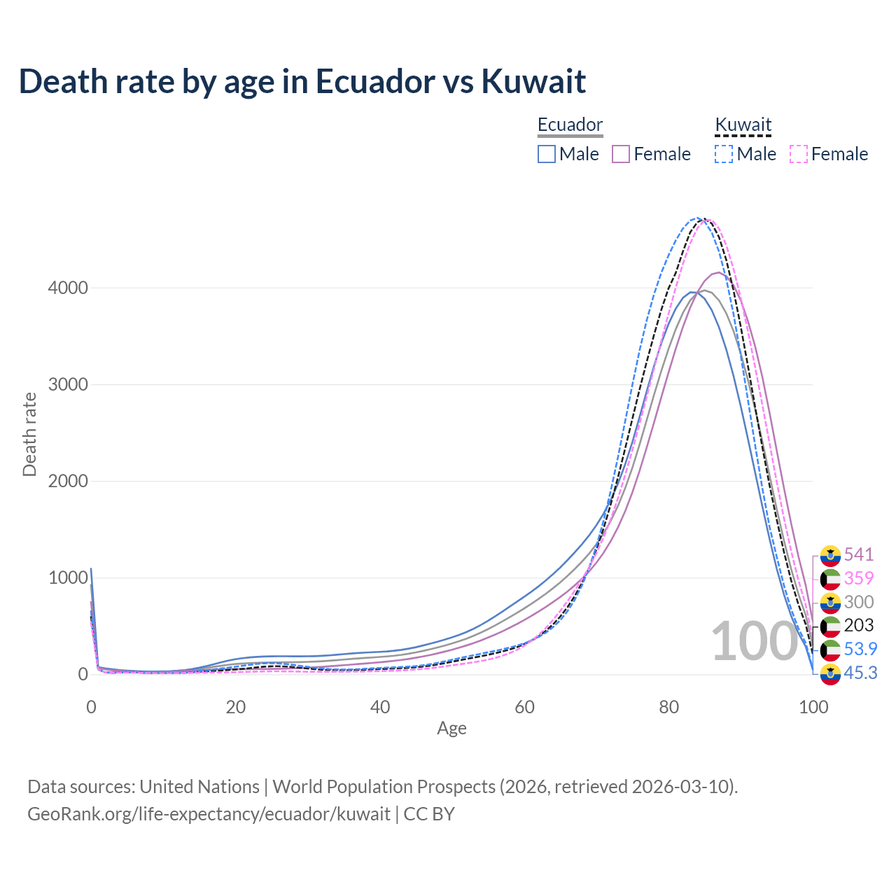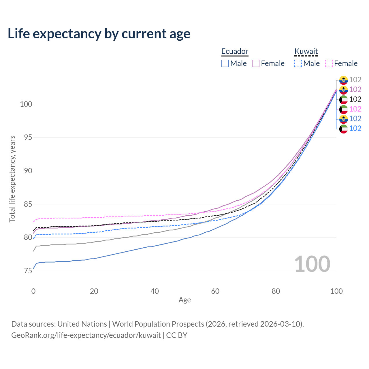 This life expectancy calculator shows the odds of living to 100, 95, 90, and below based on current age for both males and females in Ecuador and Kuwait, along with mean and median age of death. The calculations are based on the 2026 life tables (actuarial tables) from the UN World Population Prospects.