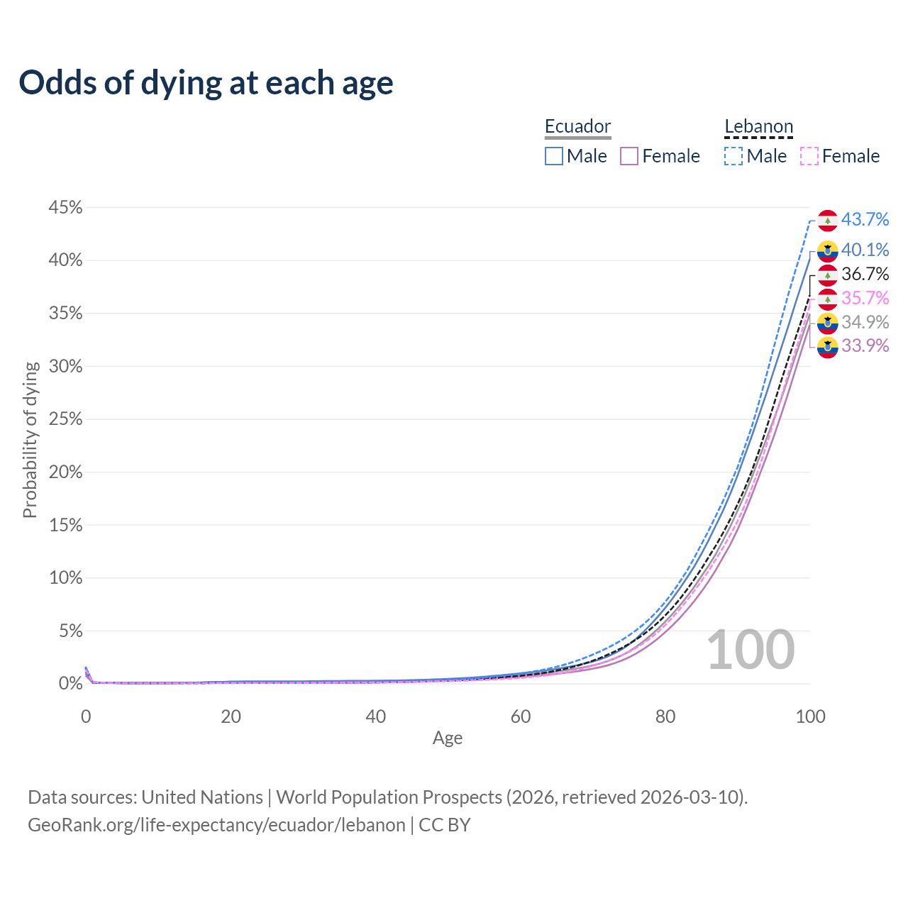 This life expectancy calculator shows the odds of living to 100, 95, 90, and below based on current age for both males and females in Ecuador and Lebanon, along with mean and median age of death. The calculations are based on the 2026 life tables (actuarial tables) from the UN World Population Prospects.