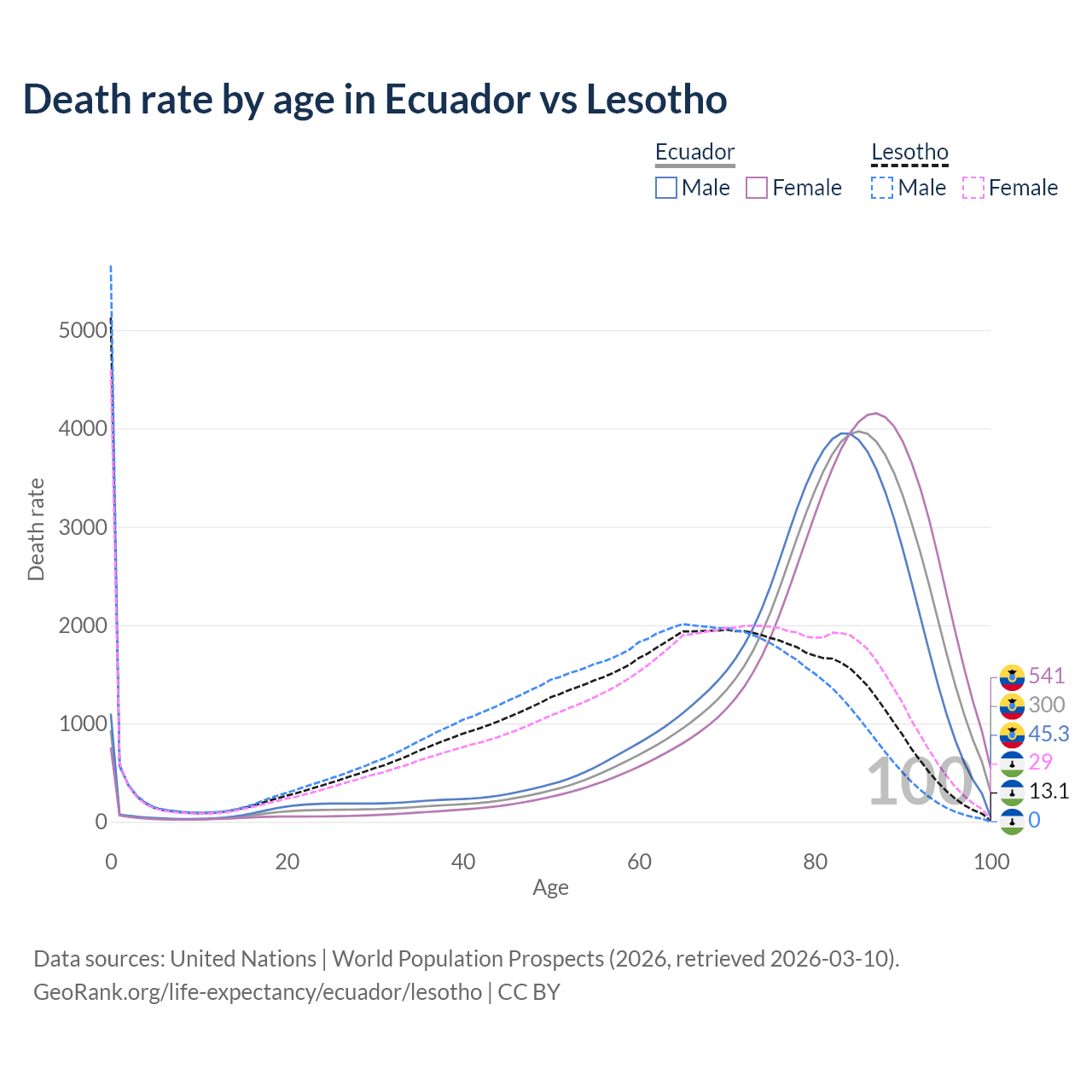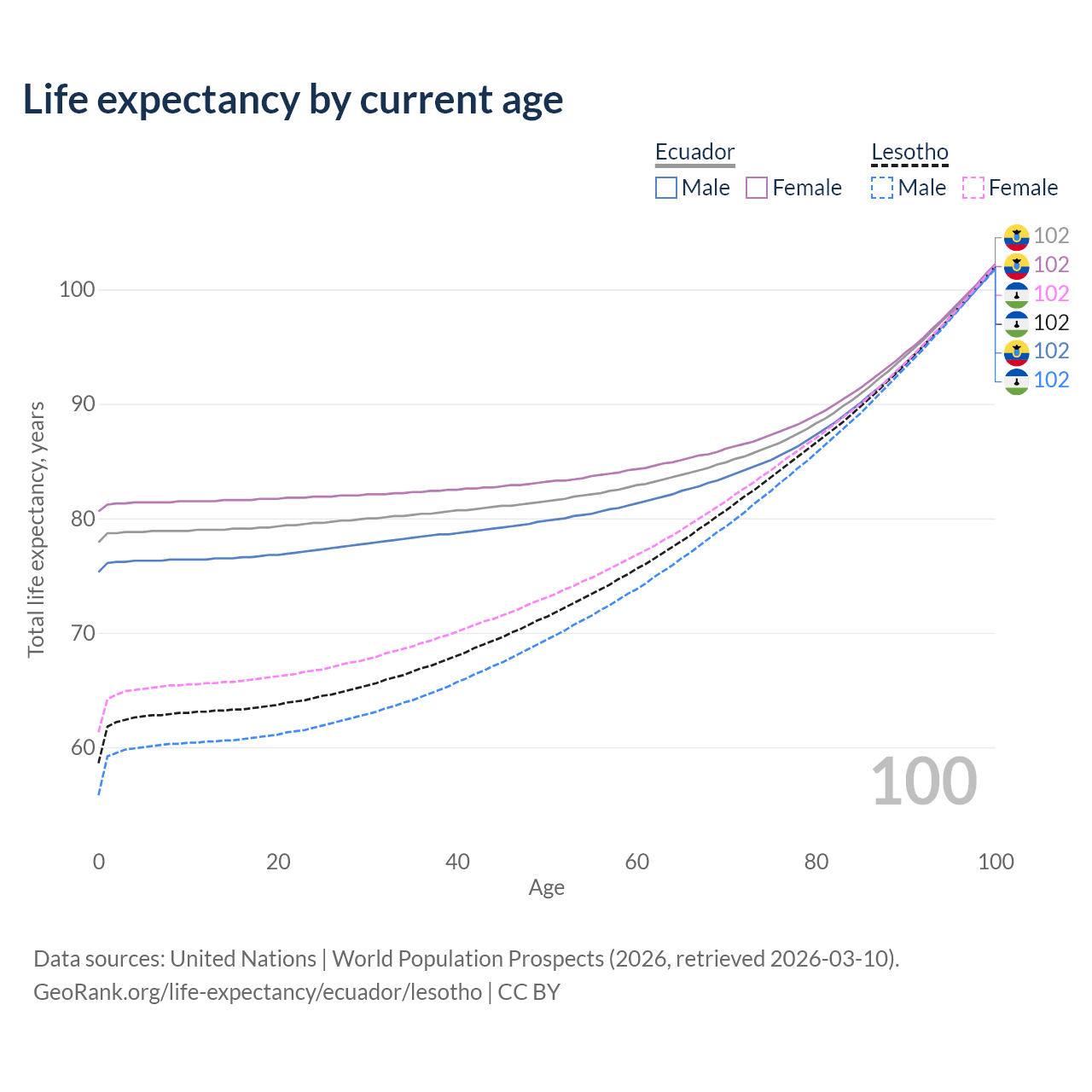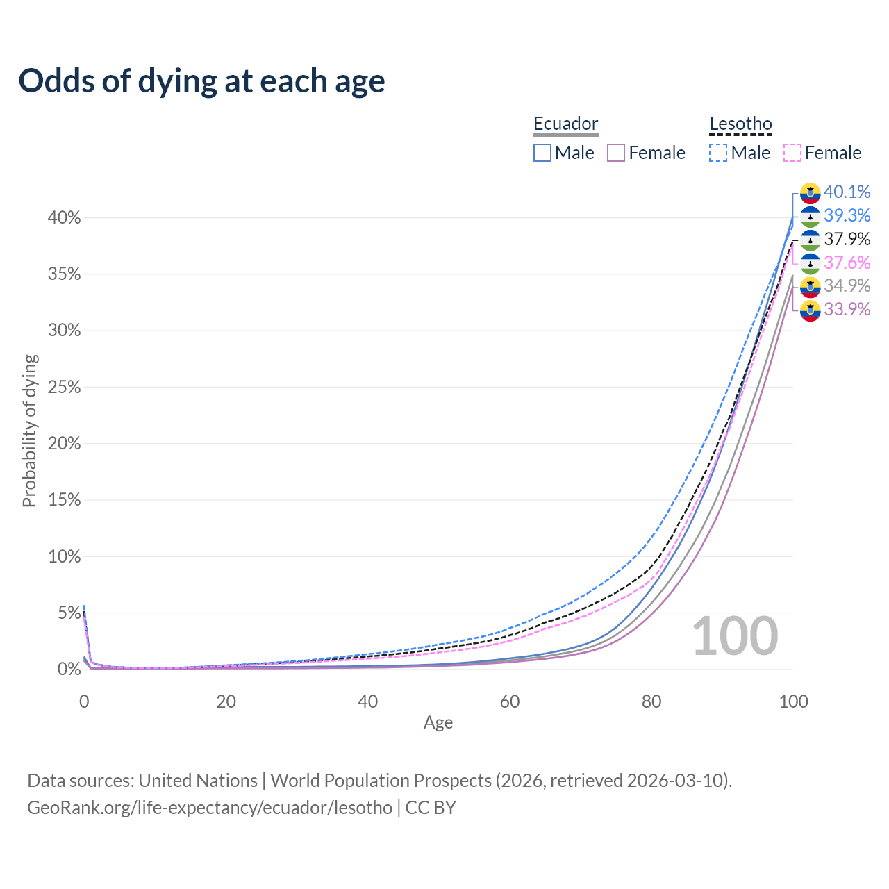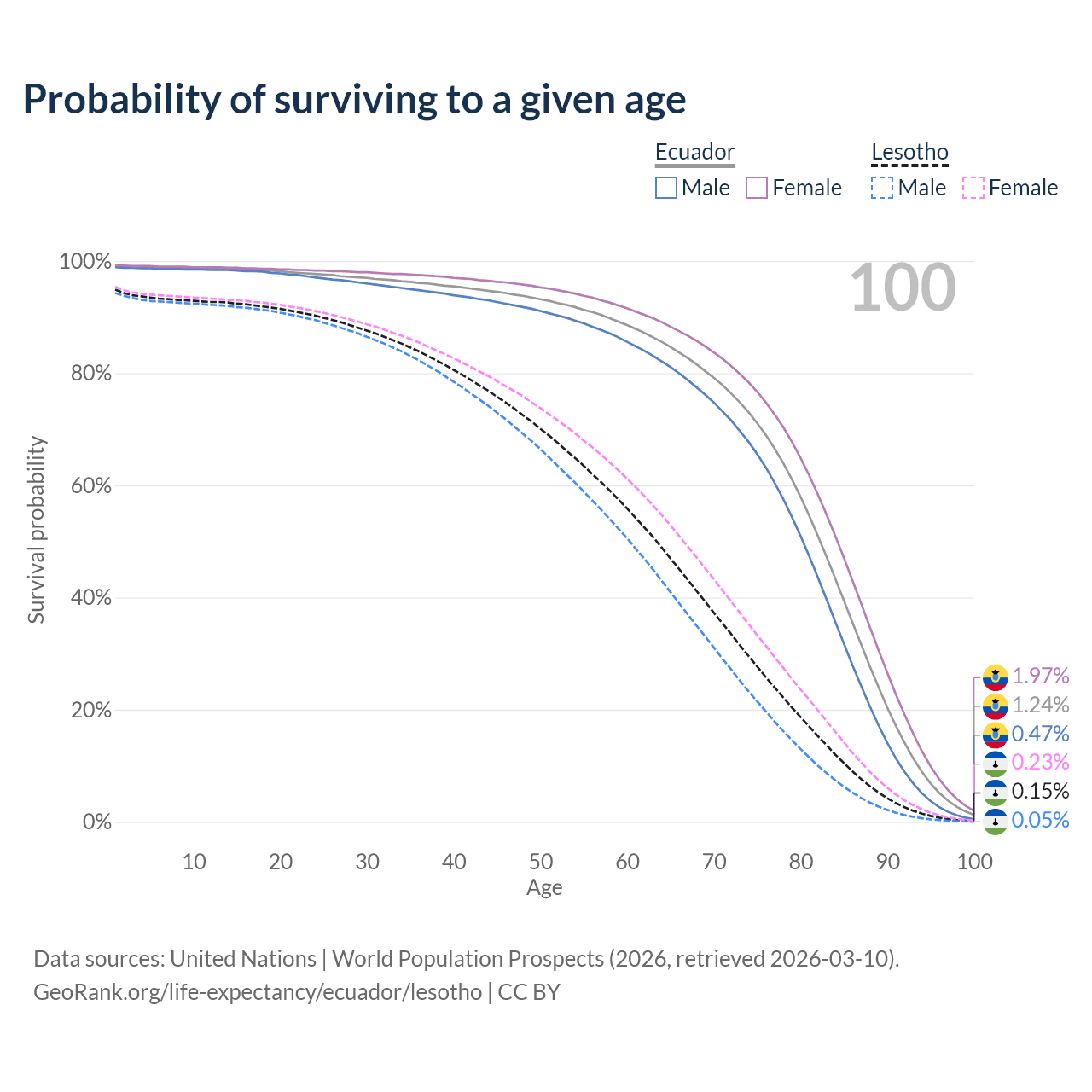 This life expectancy calculator shows the odds of living to 100, 95, 90, and below based on current age for both males and females in Ecuador and Lesotho, along with mean and median age of death. The calculations are based on the 2026 life tables (actuarial tables) from the UN World Population Prospects.
