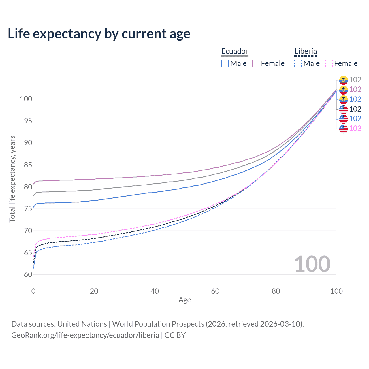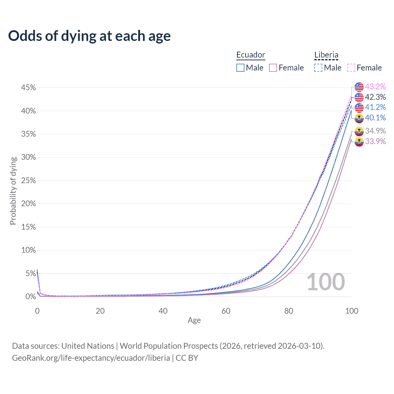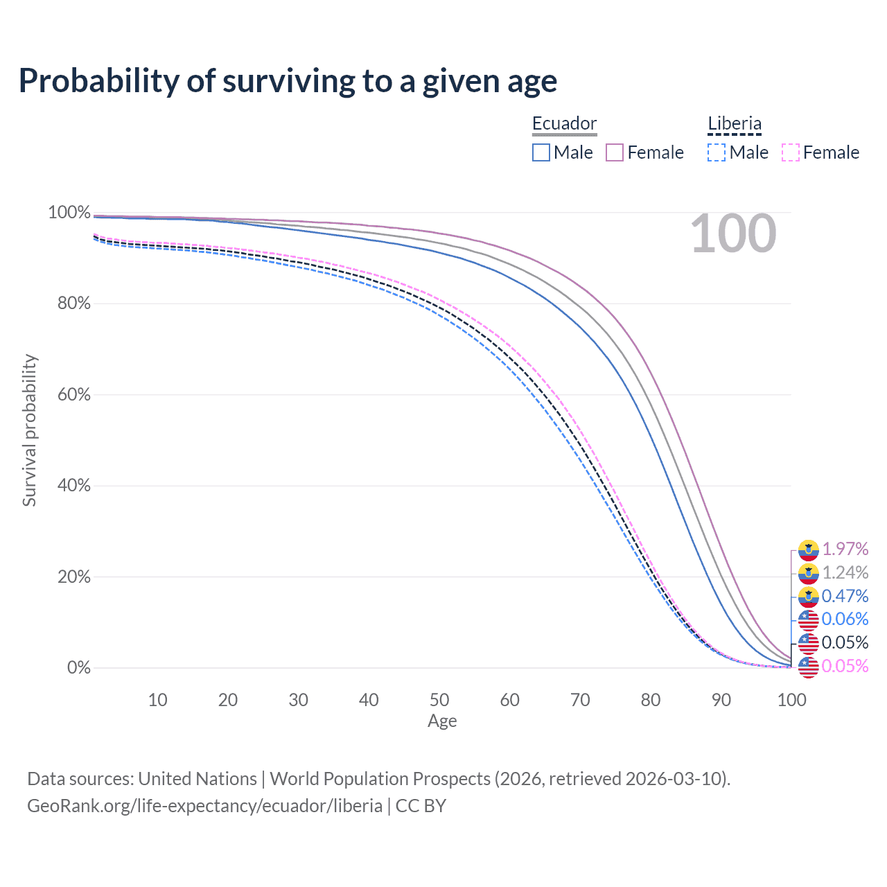 This life expectancy calculator shows the odds of living to 100, 95, 90, and below based on current age for both males and females in Ecuador and Liberia, along with mean and median age of death. The calculations are based on the 2026 life tables (actuarial tables) from the UN World Population Prospects.