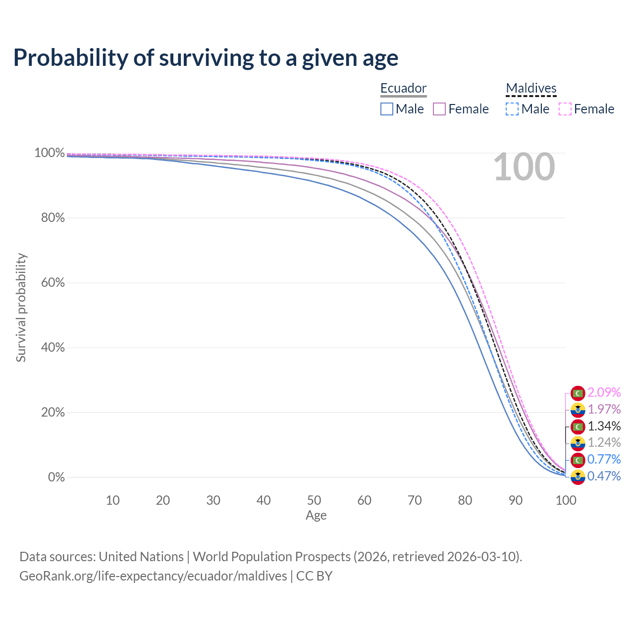 This life expectancy calculator shows the odds of living to 100, 95, 90, and below based on current age for both males and females in Ecuador and Maldives, along with mean and median age of death. The calculations are based on the 2026 life tables (actuarial tables) from the UN World Population Prospects.