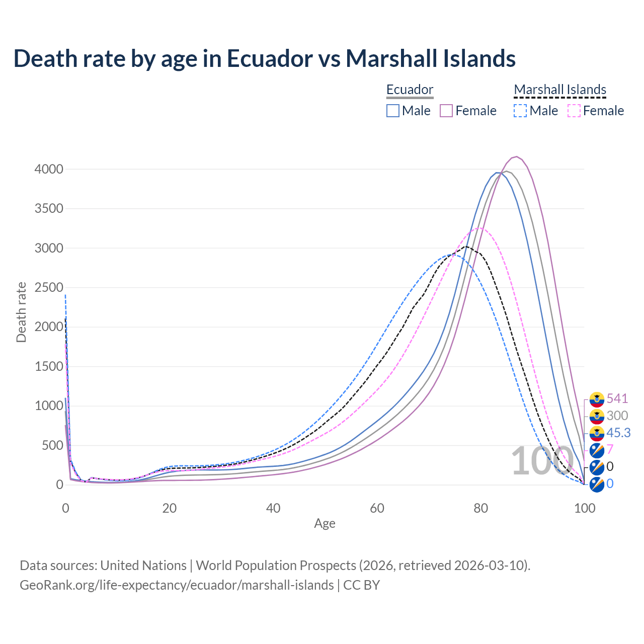 In Ecuador, the most common age of death is 85, compared to 77 in the Marshall Islands. The median age of death is 82.3 in Ecuador and 72 in the Marshall Islands, meaning only half of each cohort is expected to live past that age.