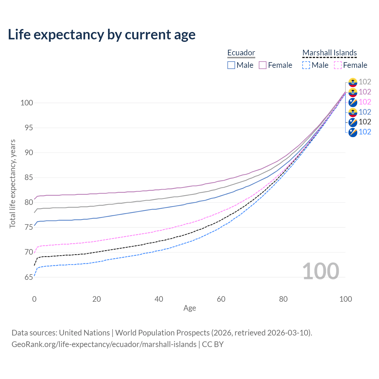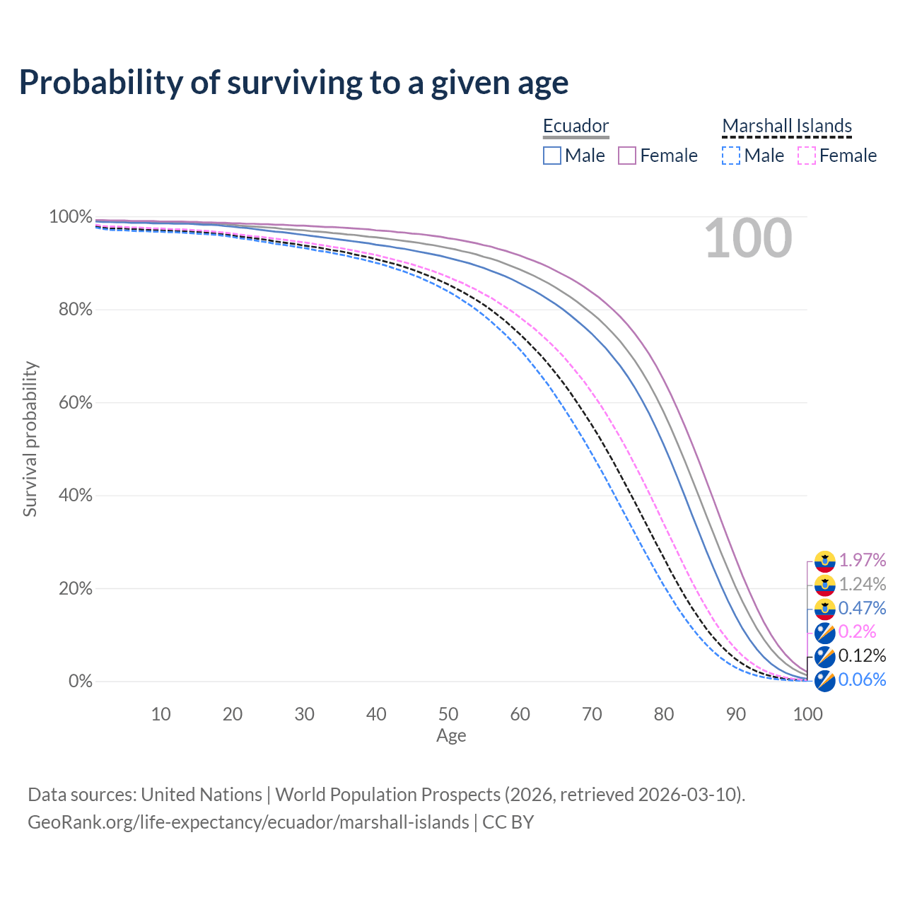 This life expectancy calculator shows the odds of living to 100, 95, 90, and below based on current age for both males and females in Ecuador and the Marshall Islands, along with mean and median age of death. The calculations are based on the 2026 life tables (actuarial tables) from the UN World Population Prospects.