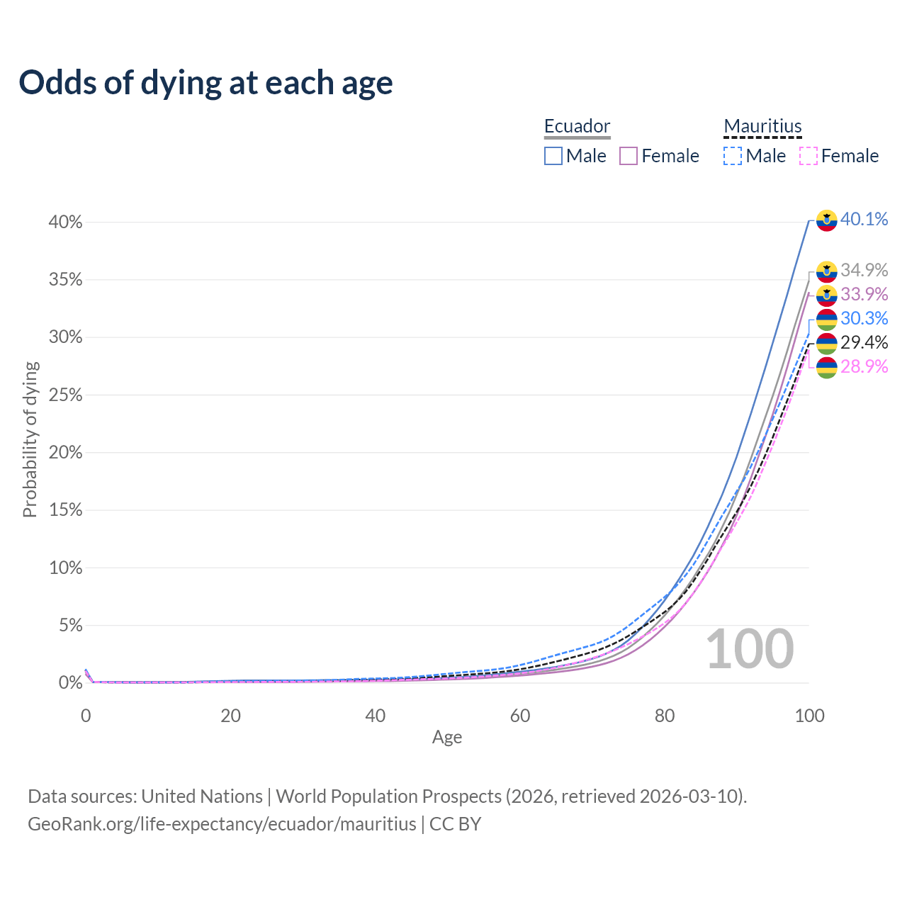 This life expectancy calculator shows the odds of living to 100, 95, 90, and below based on current age for both males and females in Ecuador and Mauritius, along with mean and median age of death. The calculations are based on the 2026 life tables (actuarial tables) from the UN World Population Prospects.