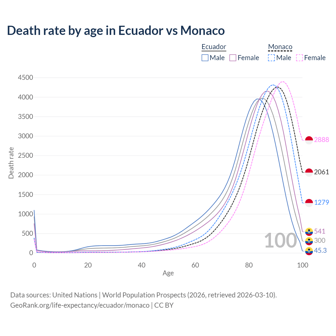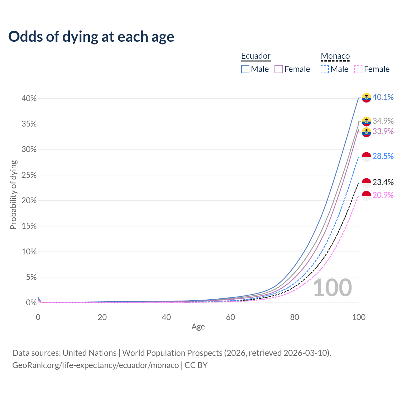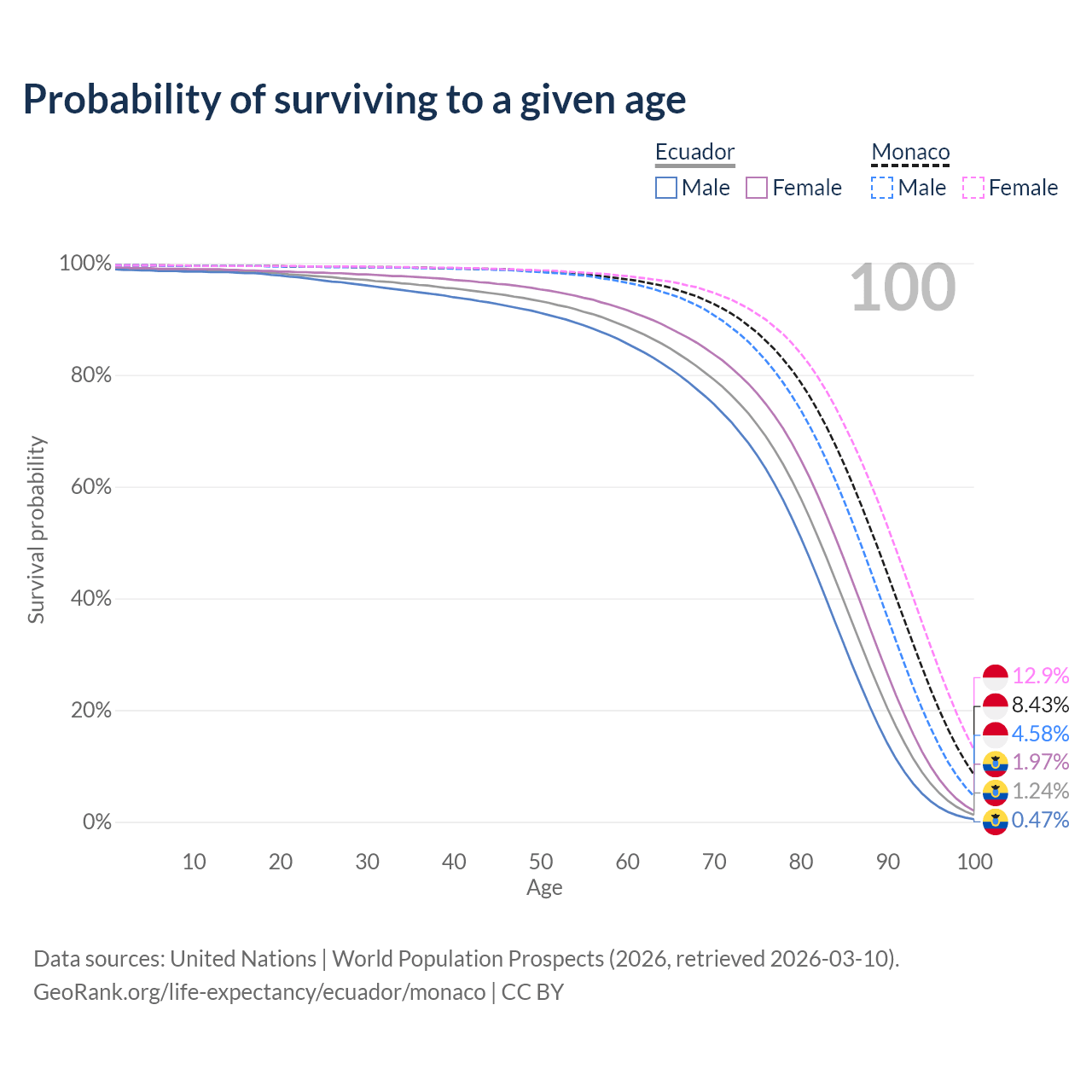 This life expectancy calculator shows the odds of living to 100, 95, 90, and below based on current age for both males and females in Ecuador and Monaco, along with mean and median age of death. The calculations are based on the 2026 life tables (actuarial tables) from the UN World Population Prospects.