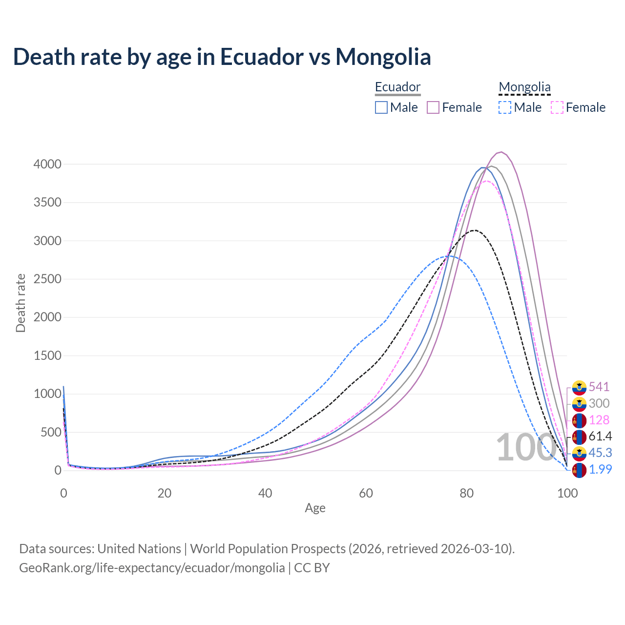 In Ecuador, the most common age of death is 85, compared to 82 in Mongolia. The median age of death is 82.3 in Ecuador and 76 in Mongolia, meaning only half of each cohort is expected to live past that age.