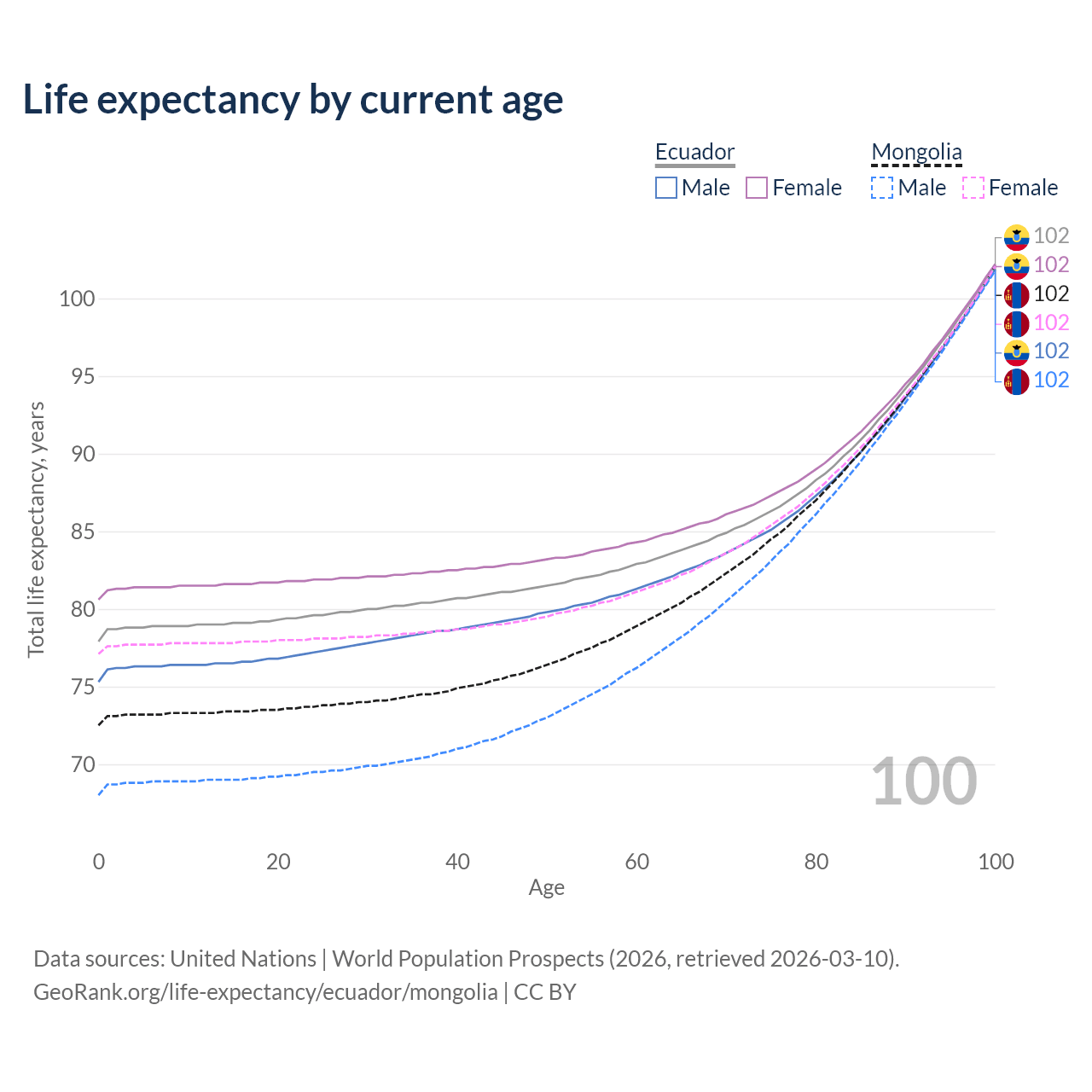 This life expectancy calculator shows the odds of living to 100, 95, 90, and below based on current age for both males and females in Ecuador and Mongolia, along with mean and median age of death. The calculations are based on the 2026 life tables (actuarial tables) from the UN World Population Prospects.