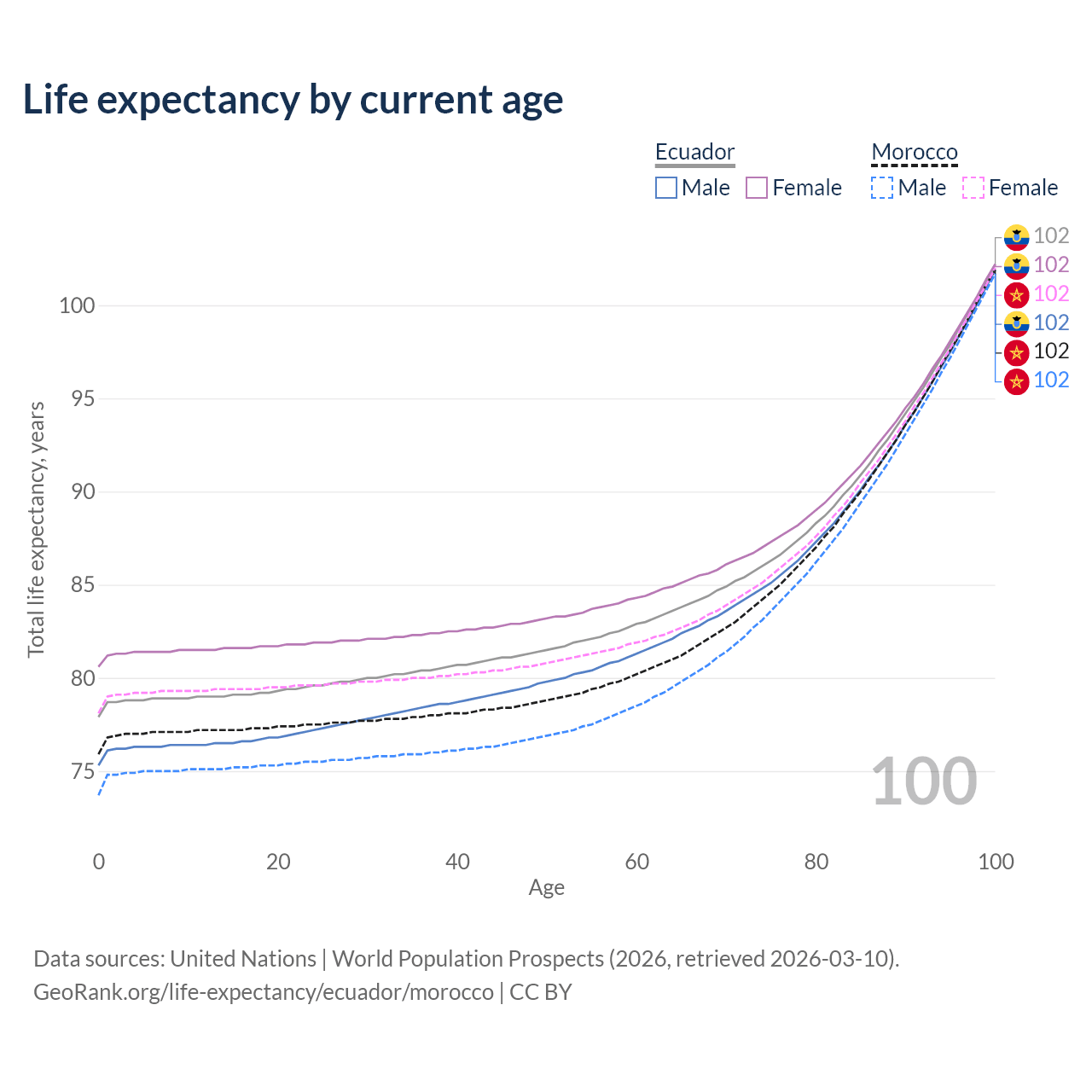 This life expectancy calculator shows the odds of living to 100, 95, 90, and below based on current age for both males and females in Ecuador and Morocco, along with mean and median age of death. The calculations are based on the 2026 life tables (actuarial tables) from the UN World Population Prospects.