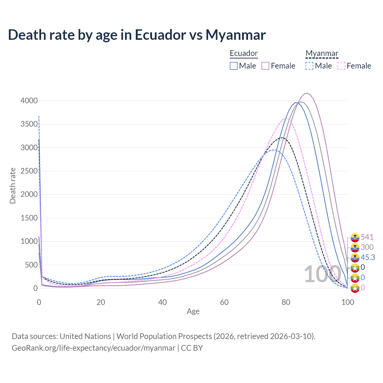 This life expectancy calculator shows the odds of living to 100, 95, 90, and below based on current age for both males and females in Ecuador and Myanmar, along with mean and median age of death. The calculations are based on the 2026 life tables (actuarial tables) from the UN World Population Prospects.