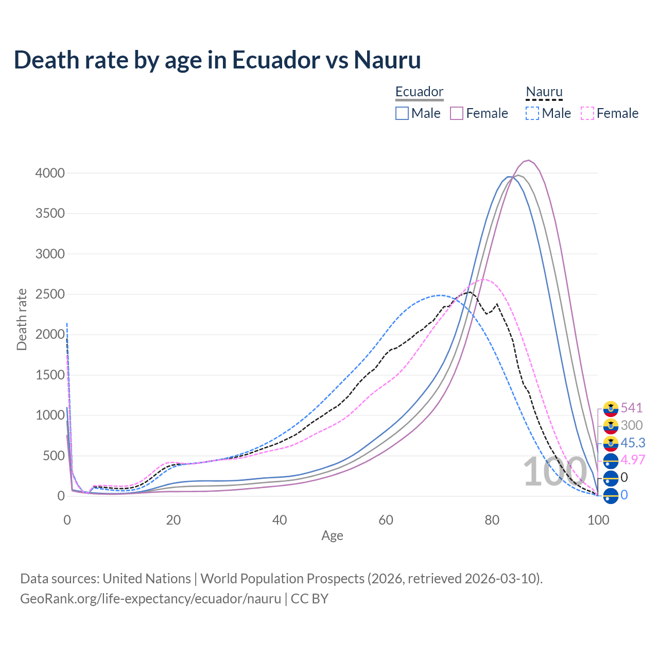 In Ecuador, the most common age of death is 85, compared to 76 in Nauru. The median age of death is 82.3 in Ecuador and 67.3 in Nauru, meaning only half of each cohort is expected to live past that age.