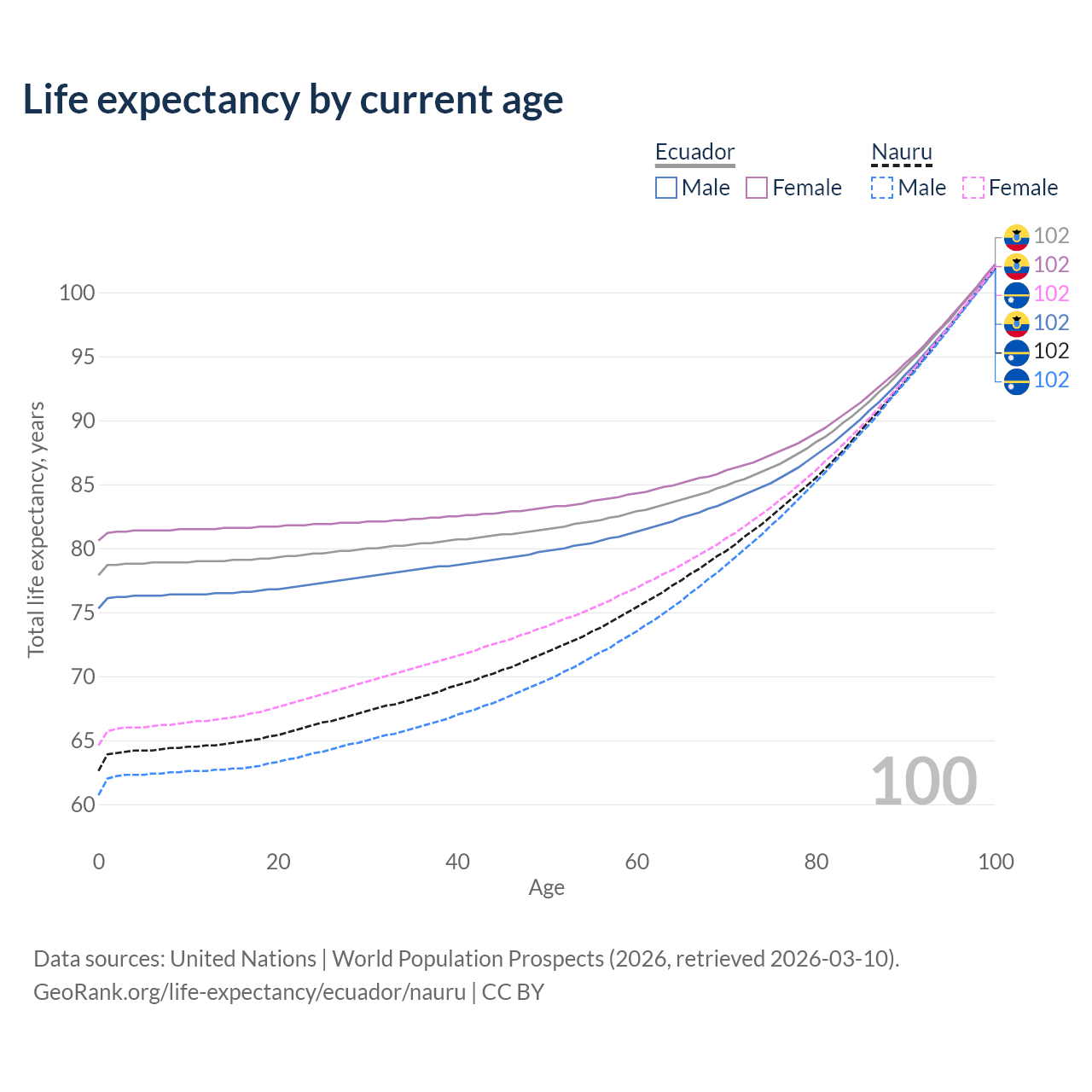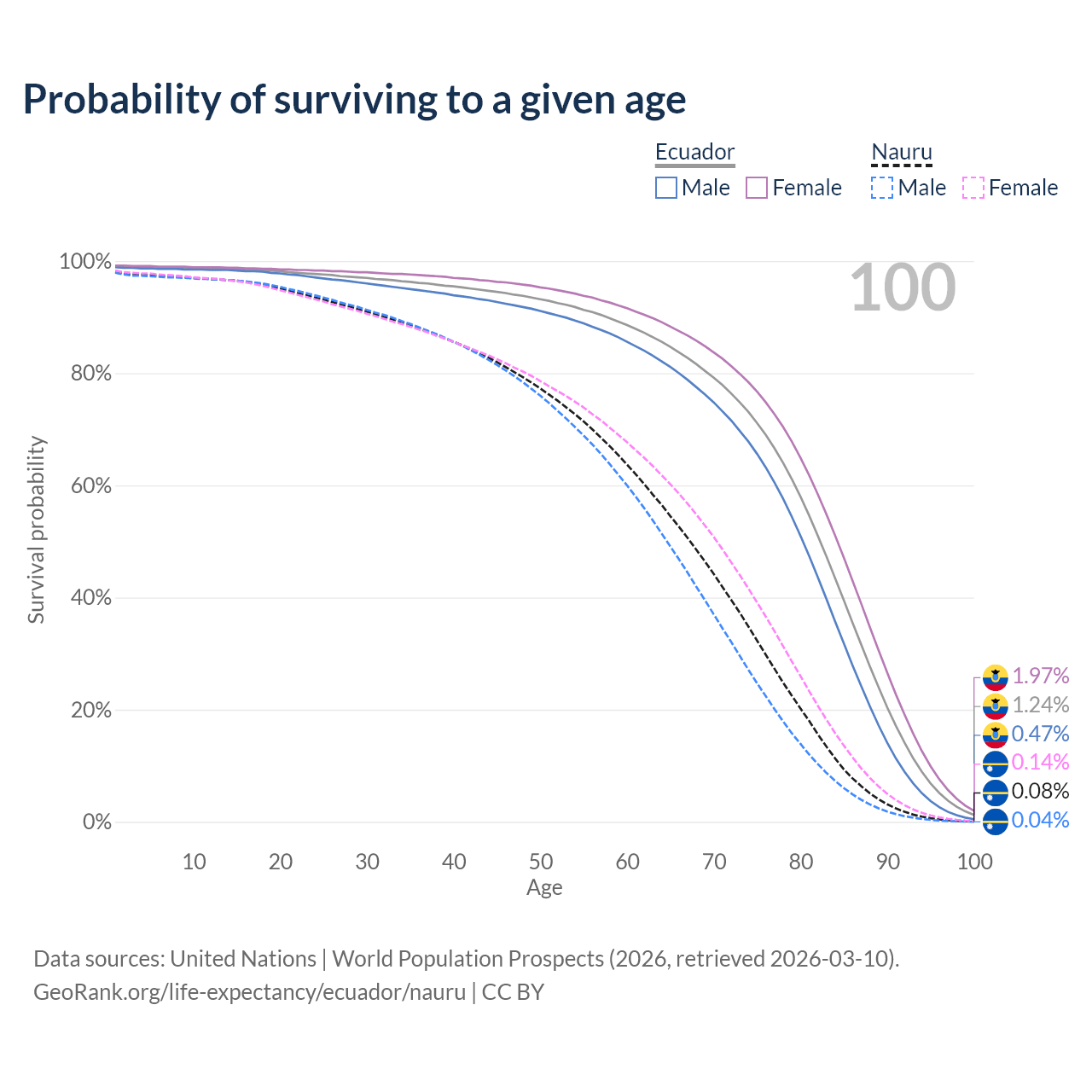 This life expectancy calculator shows the odds of living to 100, 95, 90, and below based on current age for both males and females in Ecuador and Nauru, along with mean and median age of death. The calculations are based on the 2026 life tables (actuarial tables) from the UN World Population Prospects.