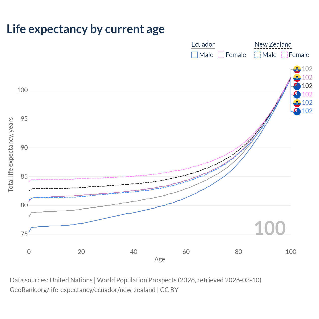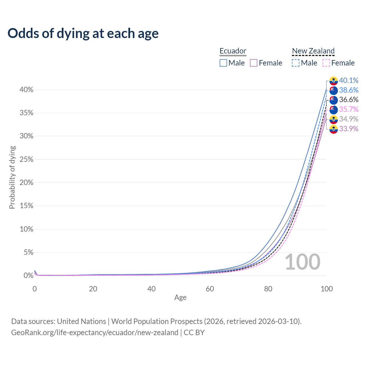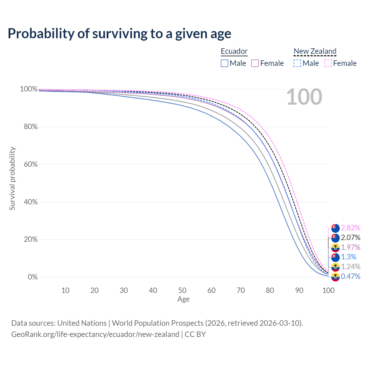 This life expectancy calculator shows the odds of living to 100, 95, 90, and below based on current age for both males and females in Ecuador and New Zealand, along with mean and median age of death. The calculations are based on the 2026 life tables (actuarial tables) from the UN World Population Prospects.